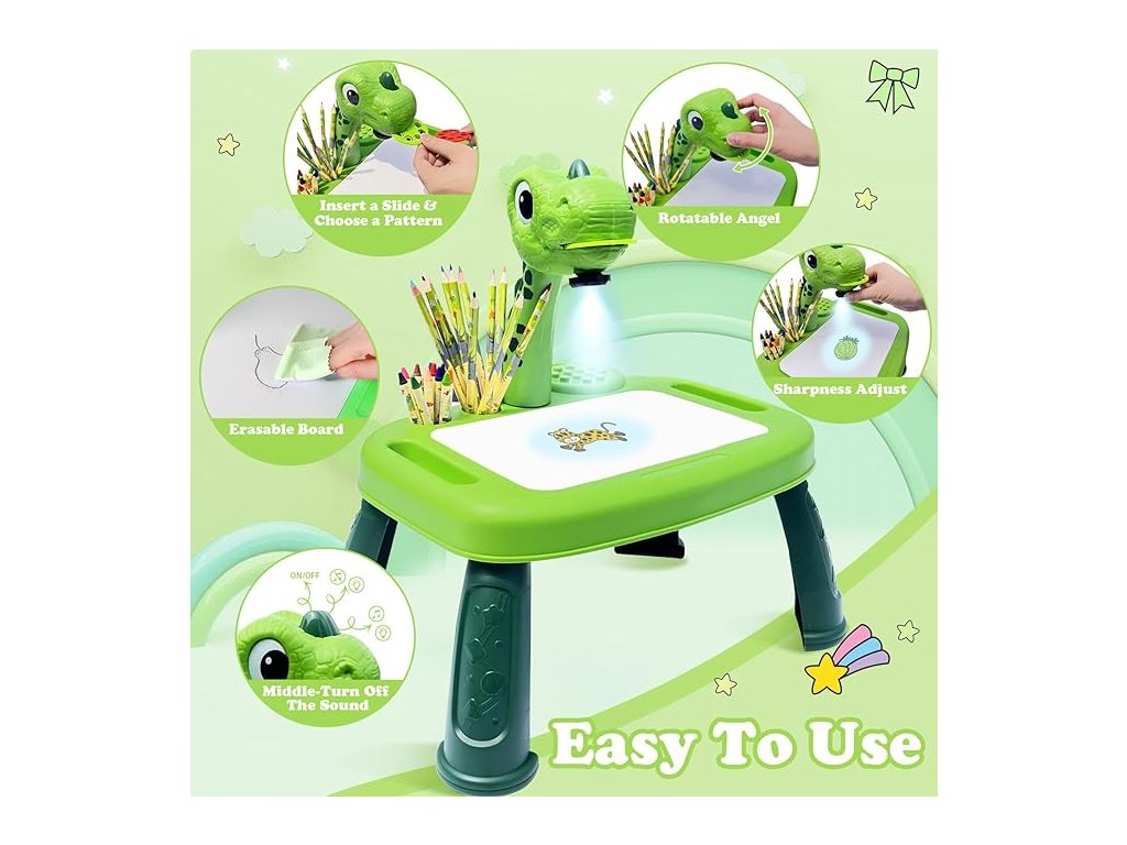 Vylepšená Veľkosť a Funkčnosť: Náš kresliaci stôl je najnovší vylepšený model , väčší a ešte lepšie vhodný pre deti. Čo viac? Ovládajte svoj zážitok s 3-pozíciovým vypínačom – môžete dokonca vypnúť zvuk a užívať si iba projekciu!