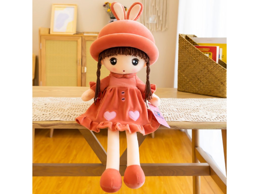 Táto roztomilá látková bábika v červených šatách si získa srdce každého dieťaťa. Jej jemné šatôčky so srdiečkami a ozdobnými gombíkmi pôsobia kúzelne a dopĺňa ich čiapočka s králičími uškami, ktorá bábike dodáva rozprávkový vzhľad. Vďaka mäkkému plyšovému materiálu a dlhým nôžkam je ideálny na maznanie, do postieľky aj na cesty.