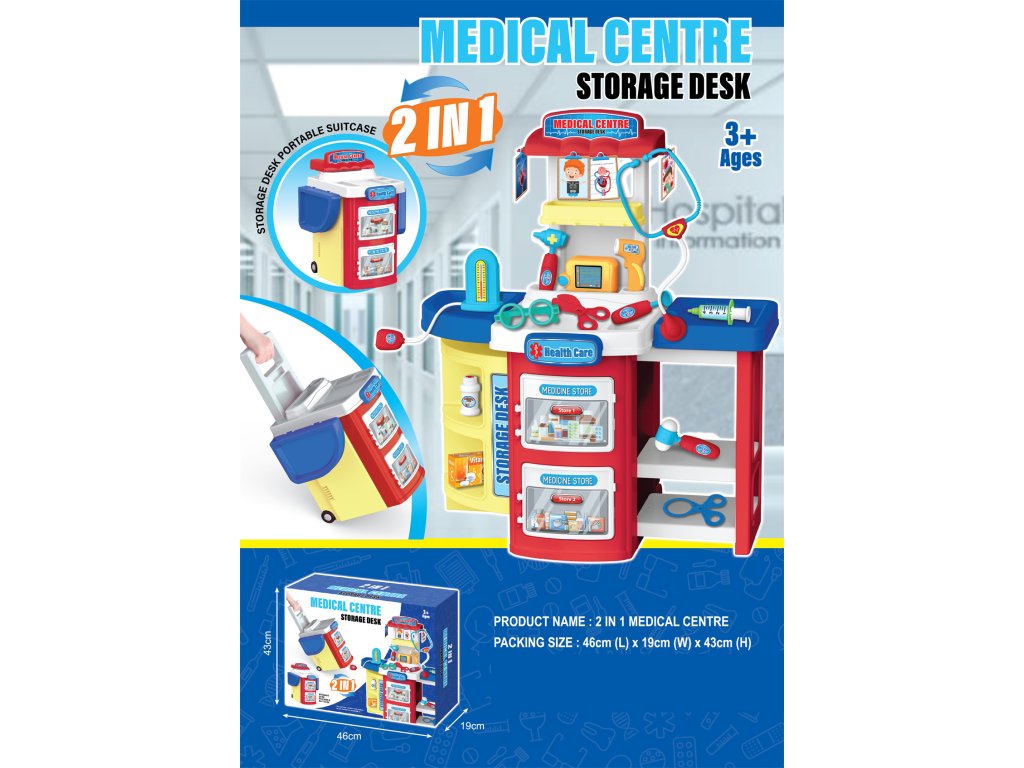 Stolík ponúka pracovnú plochu s nástrojmi, policami a zásuvkami na „lieky“, zatiaľ čo prenosný kufrík umožňuje ľahké ukladanie a prenášanie. Súprava obsahuje lekárske pomôcky ako stetoskop, injekciu, teplomer, nožnice, kladivko, okuliare a ďalšie vybavenie, ktoré rozširuje možnosti hry.