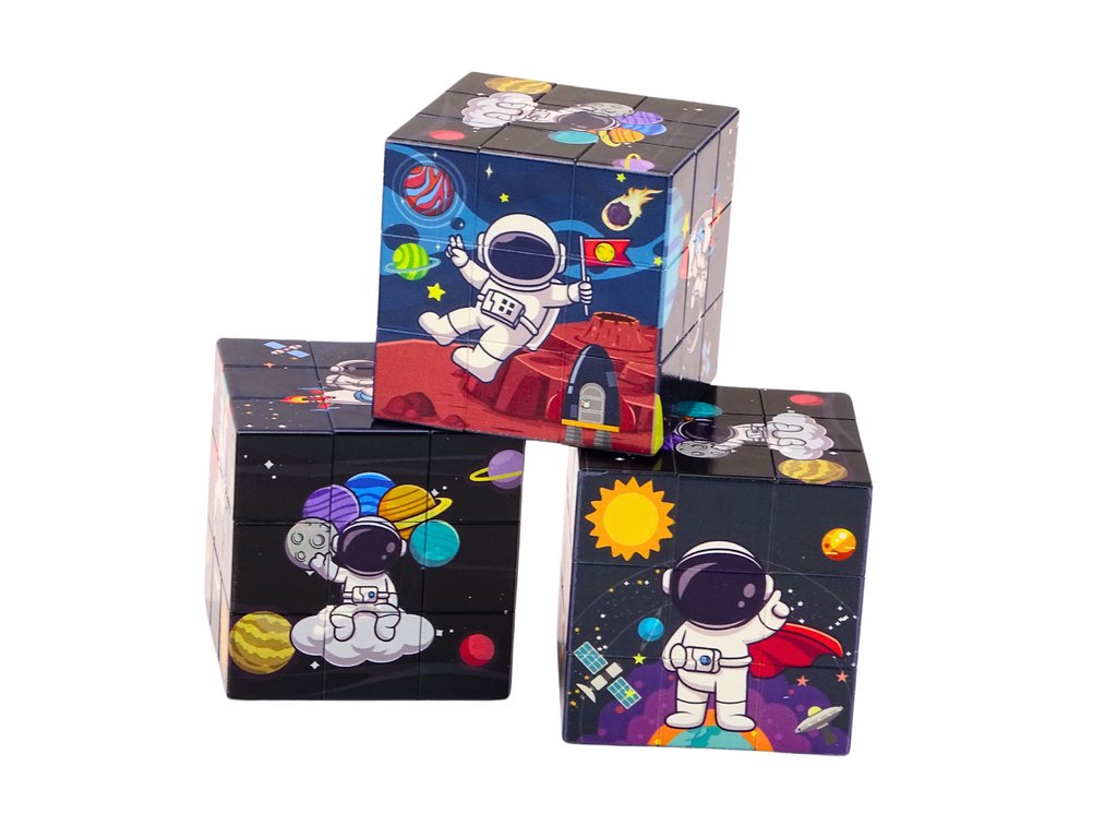 Hračka je magická kocka na skladanie, ktorá prenáša deti do sveta kozmu a zábavy. Každá strana kocky je ozdobená vzorom kozmonautov a planét a obsahuje 9 polí.