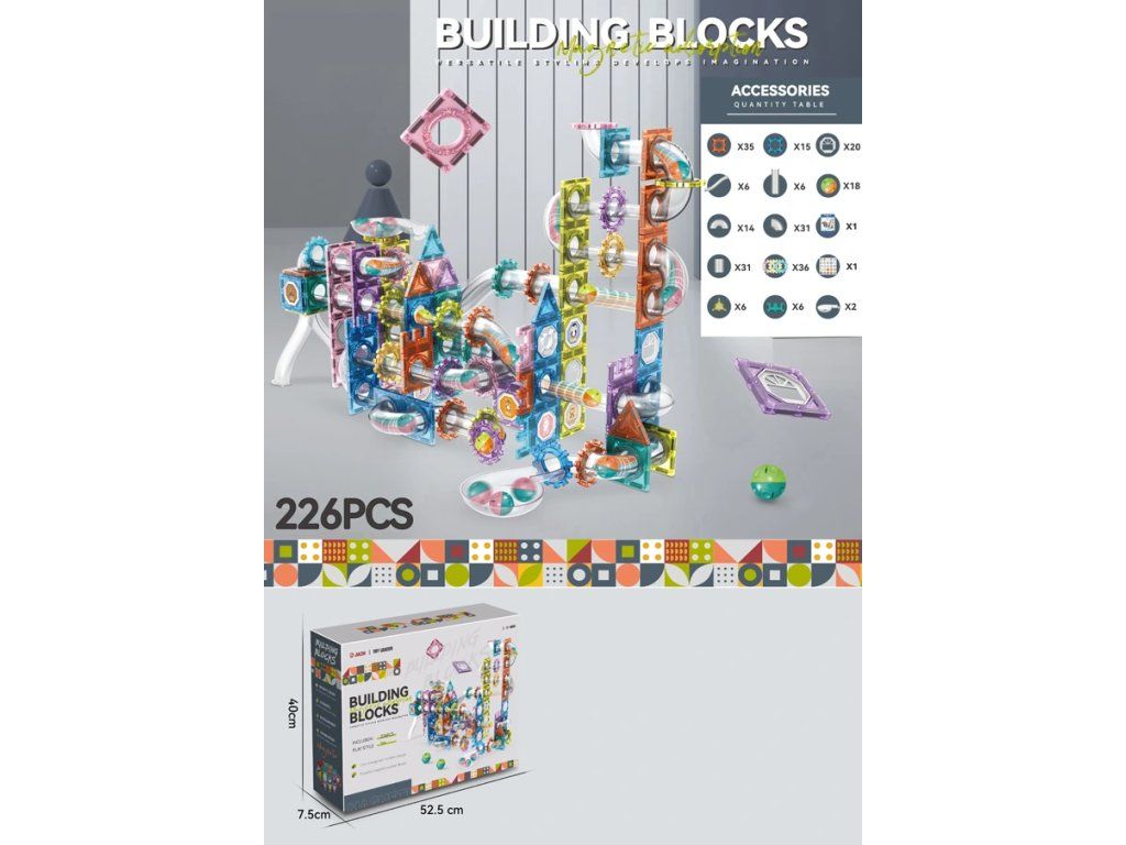 Fantastická magnetická stavebnica, ktorá spája kreatívne stavanie s dynamickou guľôčkovou dráhou! Súprava obsahuje 226 dielov rôznych tvarov, priehľadných tubusov, oblúkov, koliesok a magnetických panelov, vďaka ktorým môžu deti vytvárať vlastné farebné konštrukcie a sledovať, ako guľôčky prechádzajú po ich originálnej trase.