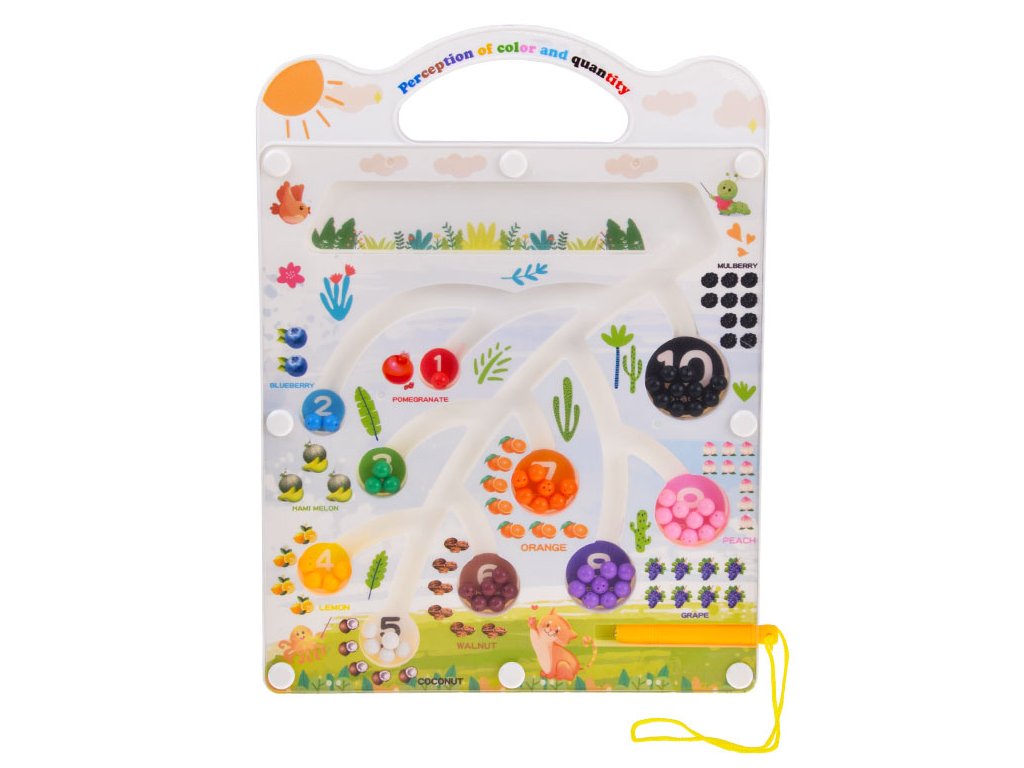 Magnetická tabuľa s bludiskom je interaktívna hračka, ktorá podporuje rozvoj dieťaťa prostredníctvom hry. Tabuľa je vyrobená z plastu v príjemných farbách. Zaujímavá, deťom priateľská grafika nabáda k hraniu. Veľkou výhodou je, že všetky pohyblivé prvky sú za priehľadným sklom, takže sa nemusíme báť, že sa guličky počas hry stratia.