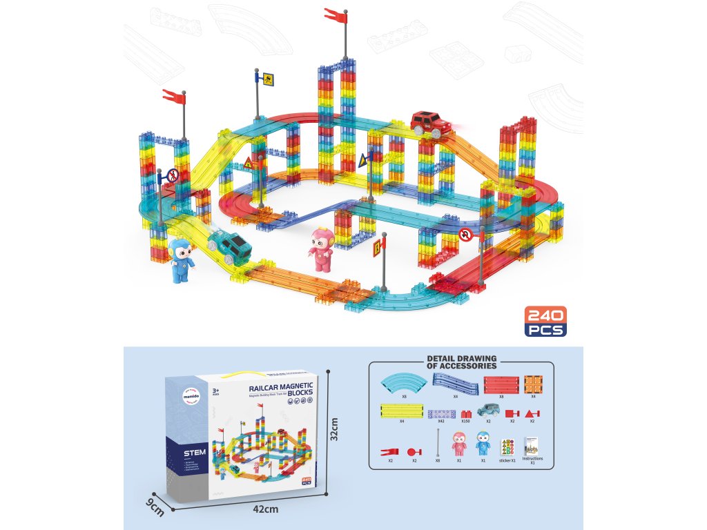 Vytvorte vlastné farebné mesto plné mostov, veží a pretekárskych dráh s touto magnetickou stavebnicou o 240 dieloch. Vďaka jednoduchému spájaniu pomocou magnetov je možné ľahko zostaviť rôzne stavby, koľaje aj rampy, po ktorých môžu jazdiť autíčka.