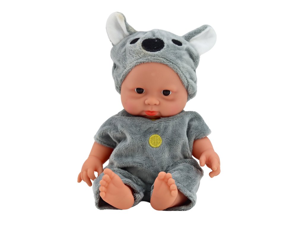 Malá bábika batoľa v šedom oblečku a čiapočke koala
