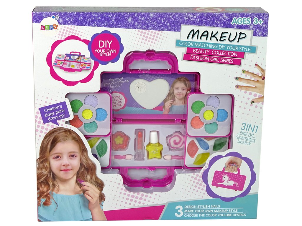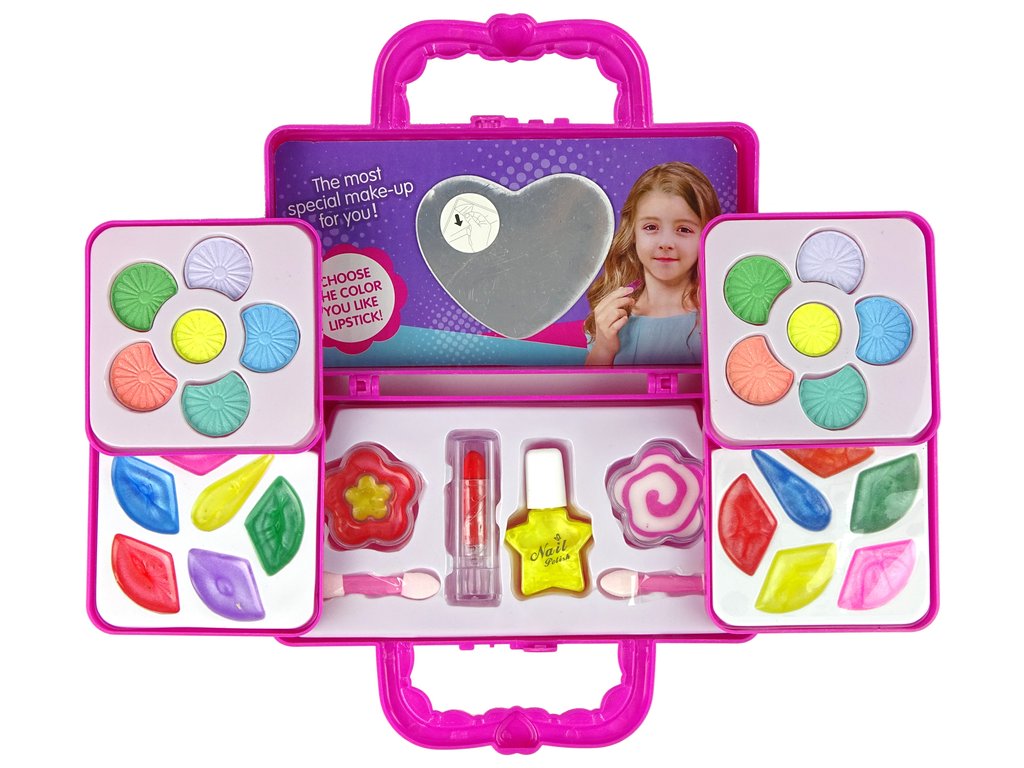 Rozkladacia kabelka pojme mnoho pokladov, množstvo očných tieňov a krásnych leskov. Prvá vrstva ukrýva až 12 očných tieňov. Druhá vrstva pojme 12 leskov na pery a posledná vrstva skrýva krásne zázraky vrátane lakov na nechty, štetcov, dvoch leskov v tvare kvetov a rúžu. Malé dievčatká si užijú super zábavu pri poznávaní tajov líčenia. A efekt si môžu skontrolovať v zrkadle v tvare srdca.
