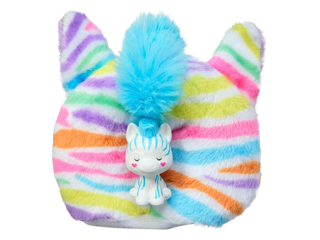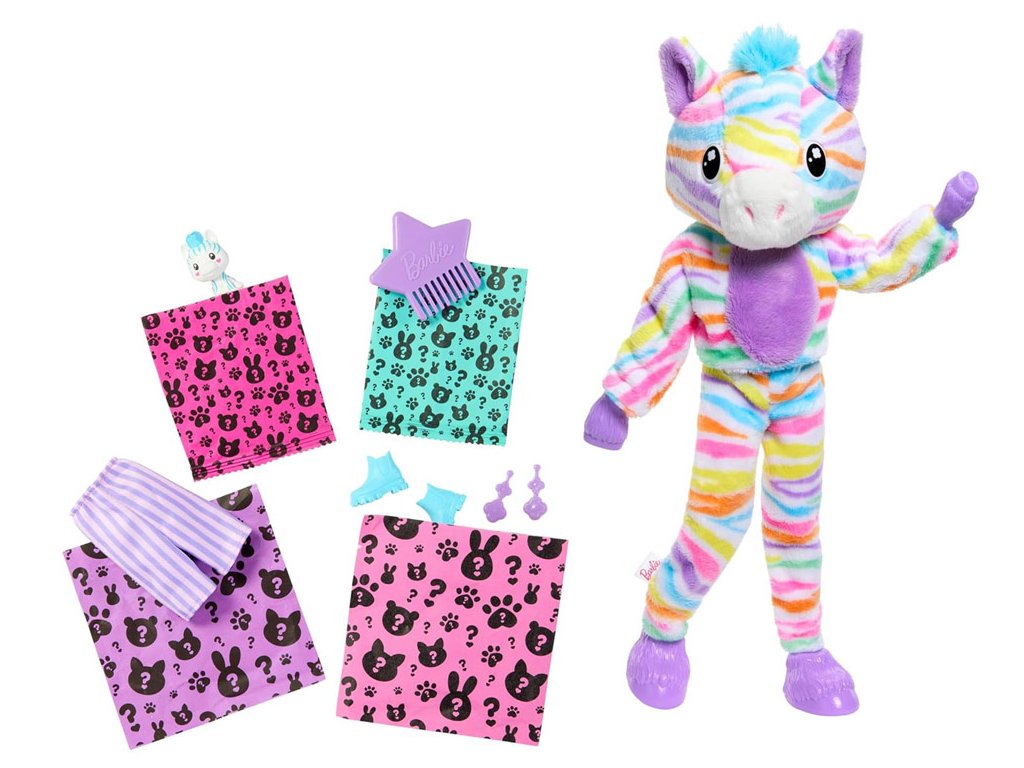 Po zložení plyšového kostýmu sa objaví štýlová bábika Barbie, pripravená na módne hrátky. Kostým však neskončí v kúte – jeho časti sa dajú použiť ako módne oblečenie. Bunda zo súpravy je obojstranná – jedna strana má farebný kvetinový vzor, druhá imituje dúhovú kožu zebry. Je to ako dva štýly v jednom!