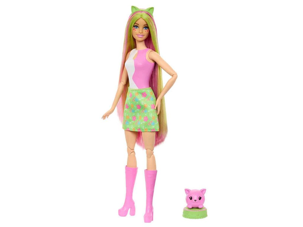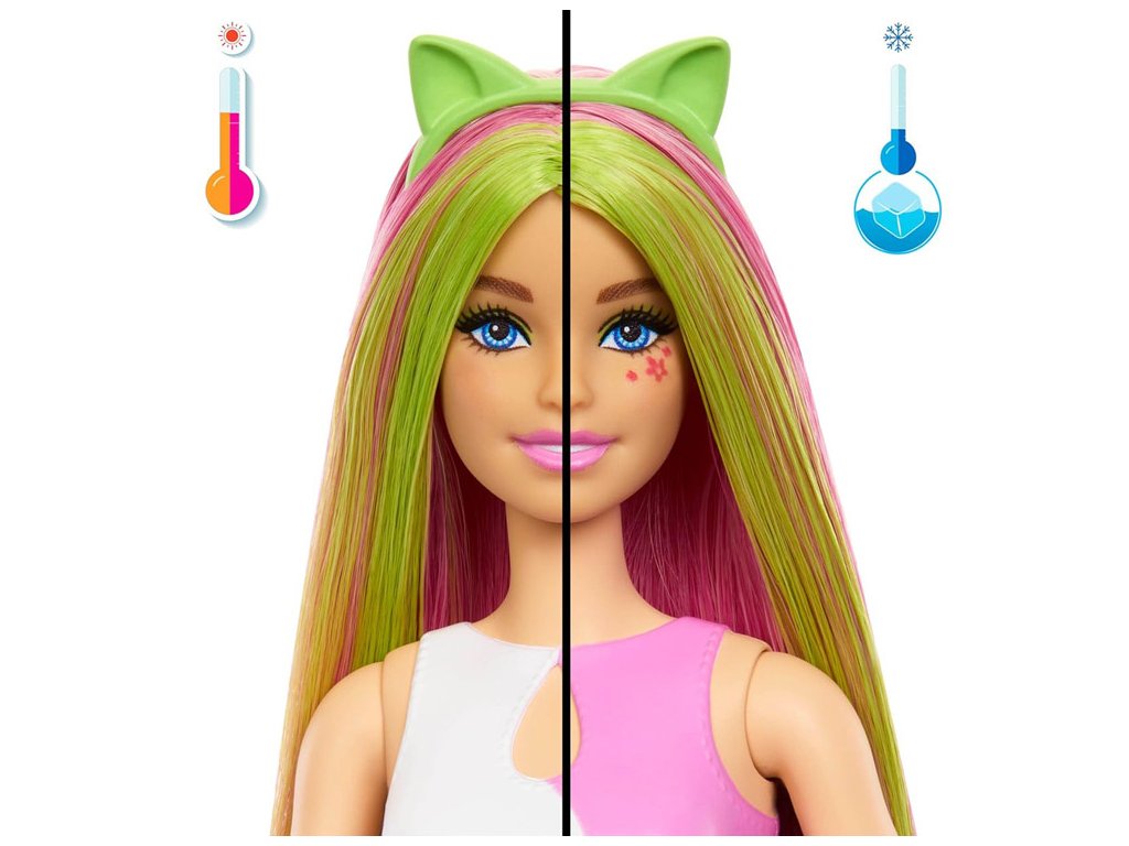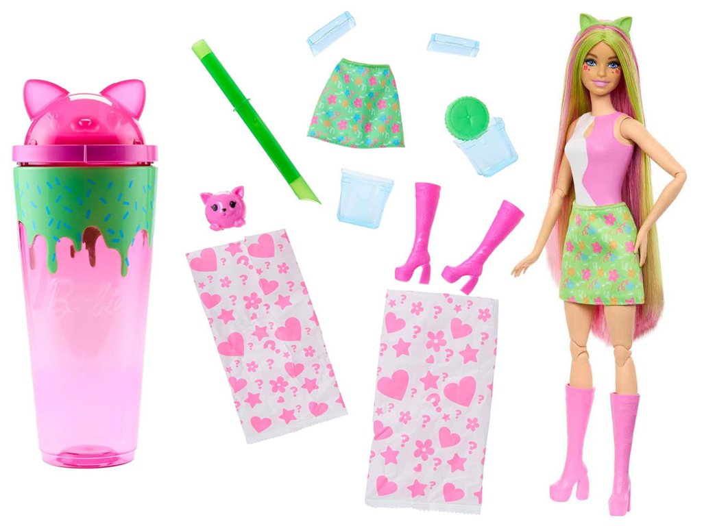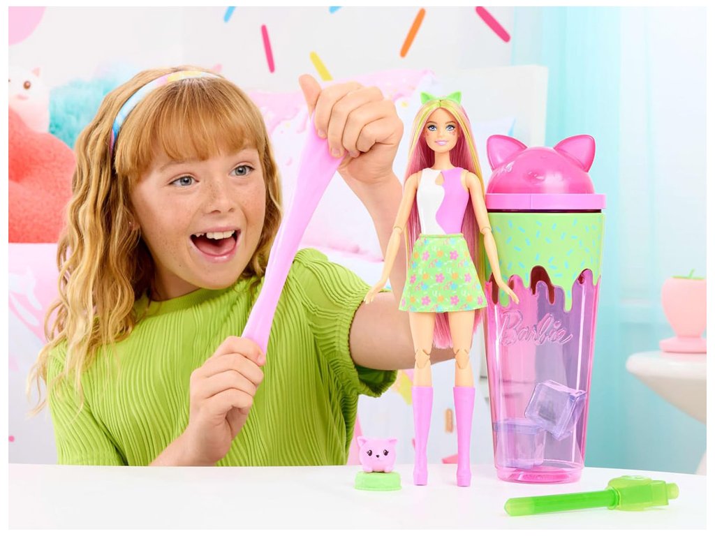 Vnútri nájdete Barbie® s intenzívne ružovo-zelenými vlasmi, jemnou vôňou ovocného kokteilu, usmievavú a pripravenú na zábavu. Sprevádza ju mäkké mačiatko, ktoré nielenže vyzerá roztomilo, ale aj krásne vonia. Súčasťou sady je pohodlný pelech pre maznáčika a čelenka s mačacími ušami, ktorá perfektne ladí so štýlom Barbie®.