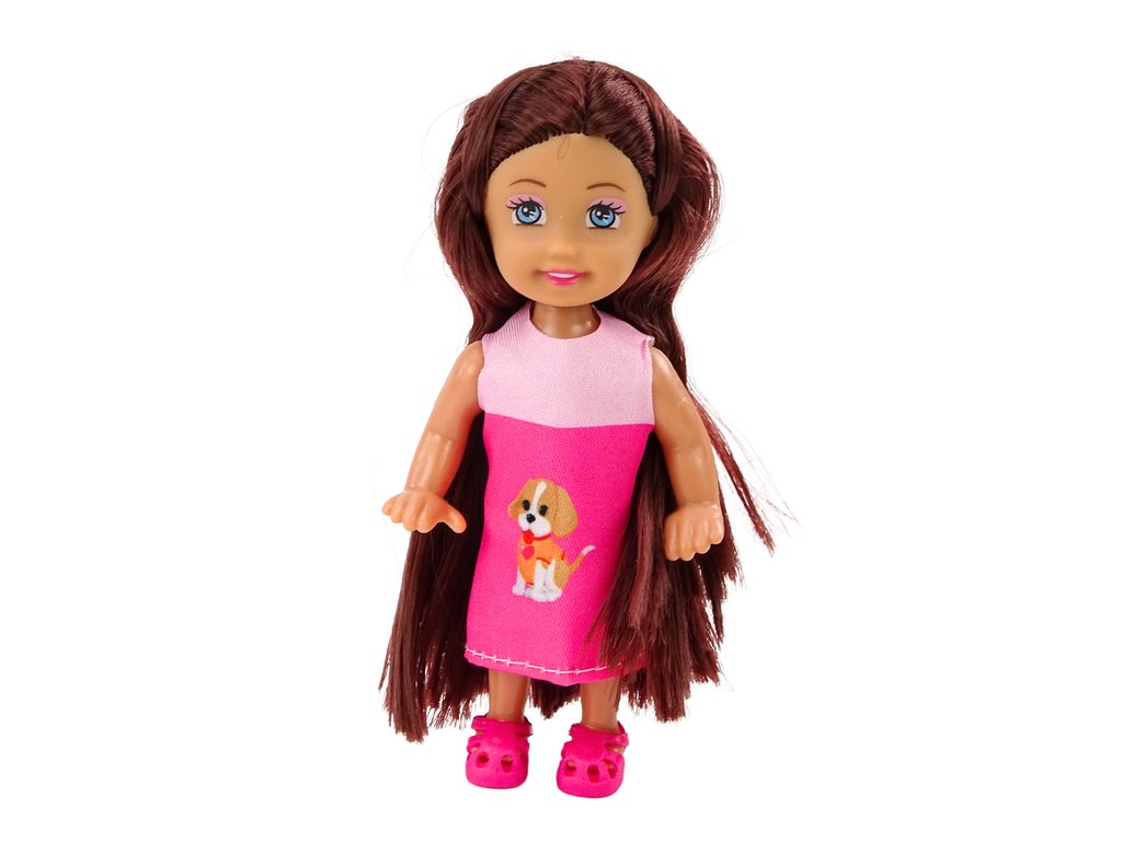 Mini bábika dlhé vlasy šaty tri psíkové pelech
