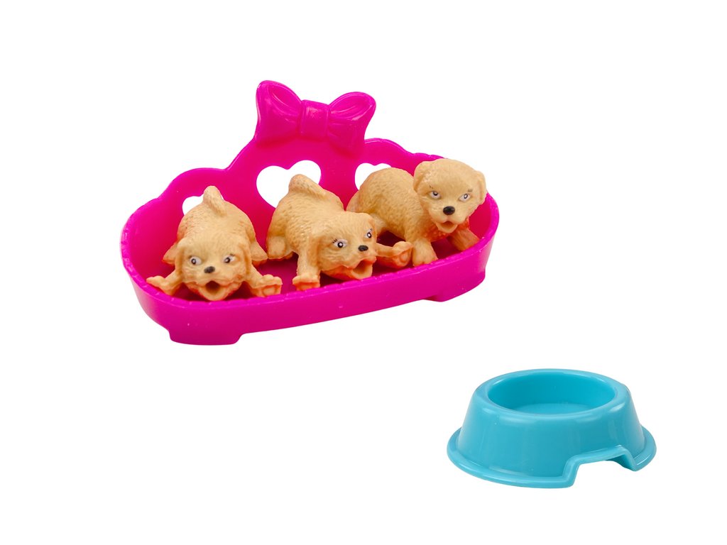 Mini bábika s dlhými vlasmi, šaty, traja psíci a pelech
