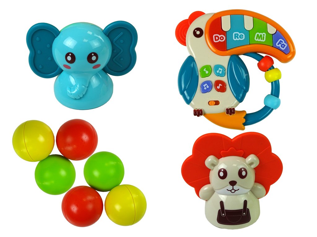 Vložte loptičky do otvoru v prvej plošine a nechajte ich voľne kotúľať než spadnúť dole. Loptičky vypadávajú z otvorov v každej úrovni. Farebné loptičky poslúži k nácviku chytanie a tiež k rozvoju koordinácie a svalovej sily.