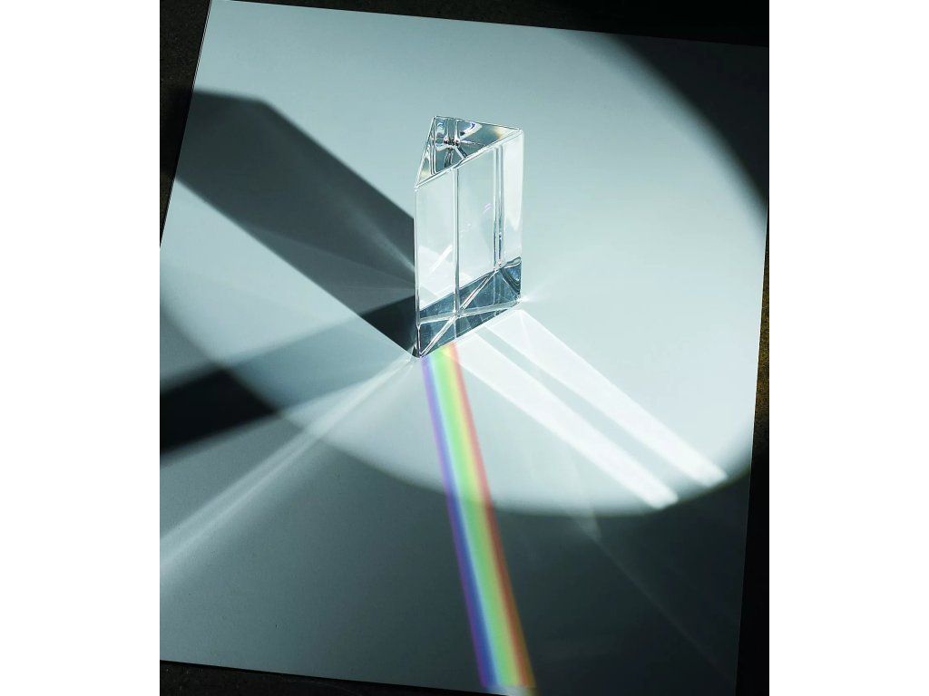 Vysoko kvalitný optický hranol s výškou 10 cm rozdeľuje biele svetlo na farebné spektrum. Umožňuje pozorovanie disperzie svetla a základných javov optiky.