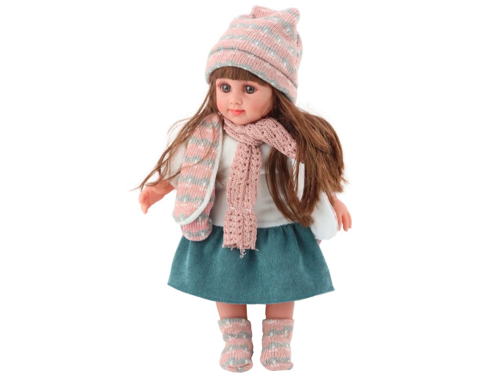 Panenka je oblečena do zimního kompletu: růžovo-šedý svetr, k němu ladící čepice a šála ve stejném vzoru, krátká zelená sukně a bílá blůzka. Celý outfit doplňují ladící ponožky, díky kterým panenka vypadá velmi módně a útulně. Díky pečlivě vybranému oblečení vypadá panenka elegantně a zároveň přirozeně – jako skutečná holčička připravená na procházku v chladnějším dni.