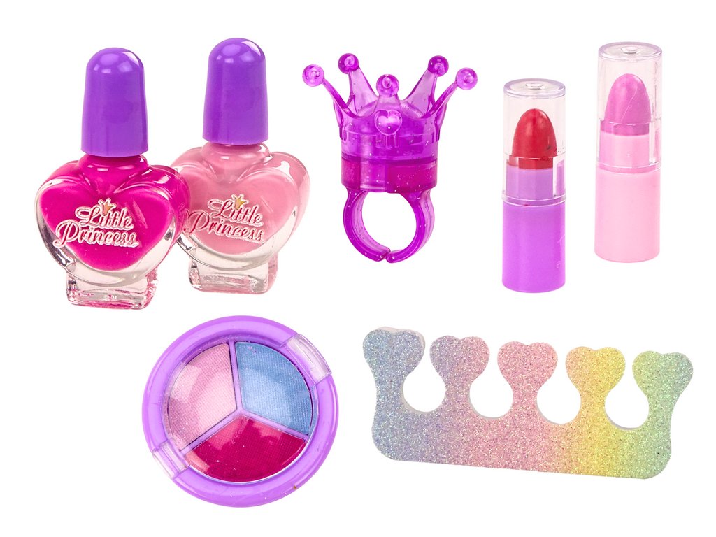 Vnútro kozmetickej taštičky ukrýva skutočné poklady pre každú malú slečnu. Dva jemne farebné laky na nechty, oddeľovač, očné tiene v troch odtieňoch, štetec na nanášanie tieňov, dva malé rúže a krásny krúžok s leskom na pery v tvare korunky - to všetko tvorí kompletnú sadu pre stylingovú zábavu.