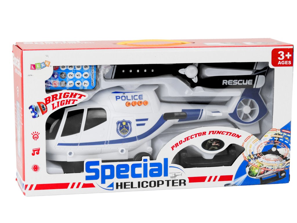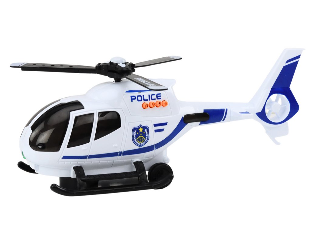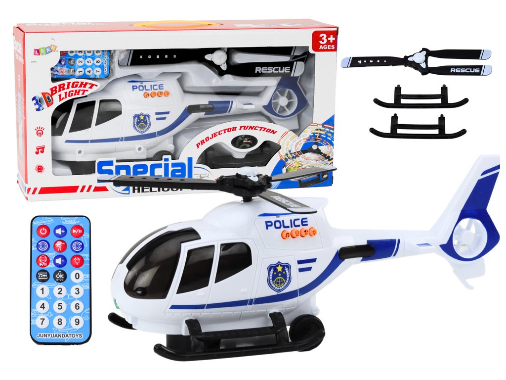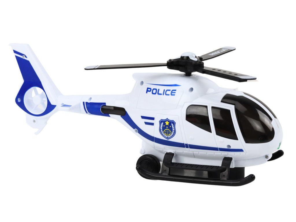 Vrtuľník je biely s modrými doplnkami, čo mu dodáva autentický a atraktívny vzhľad policajného vozidla. Štýlové prevedenie a realistický dizajn robia z hračky vyzerať ako skutočný vrtuľník. Vrtuľa vrtuľníka svieti a točí sa pri jazde, čo pridáva hre dynamiku a vizuálnu atraktivitu. Vrtuľník sa pohybuje samostatne a vďaka pokročilému mechanizmu dokáže obchádzať prekážky a otáčať sa pri jazde, čo zvyšuje realizmus a interaktivitu hry. Hračka reprodukuje realistické zvuky policajného vrtuľníka, ako je zvuk motora a sirény, čo umocňuje zážitky z hry.