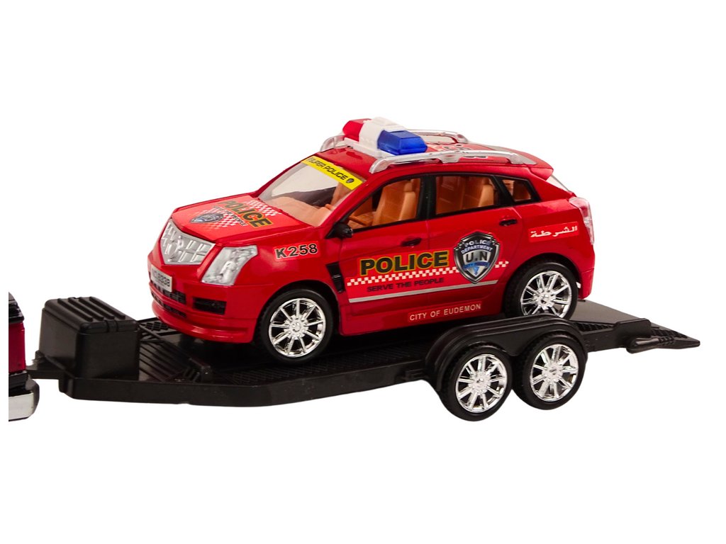 Na prívese sa nachádza červené terénne policajné auto, tiež označené nápisom „POLICE“. Toto auto je navrhnuté tak, aby vyzeralo pevne a pripravené na akciu v náročnom teréne, čo z neho robí ideálnu hračku pre rôzne tematické hry.