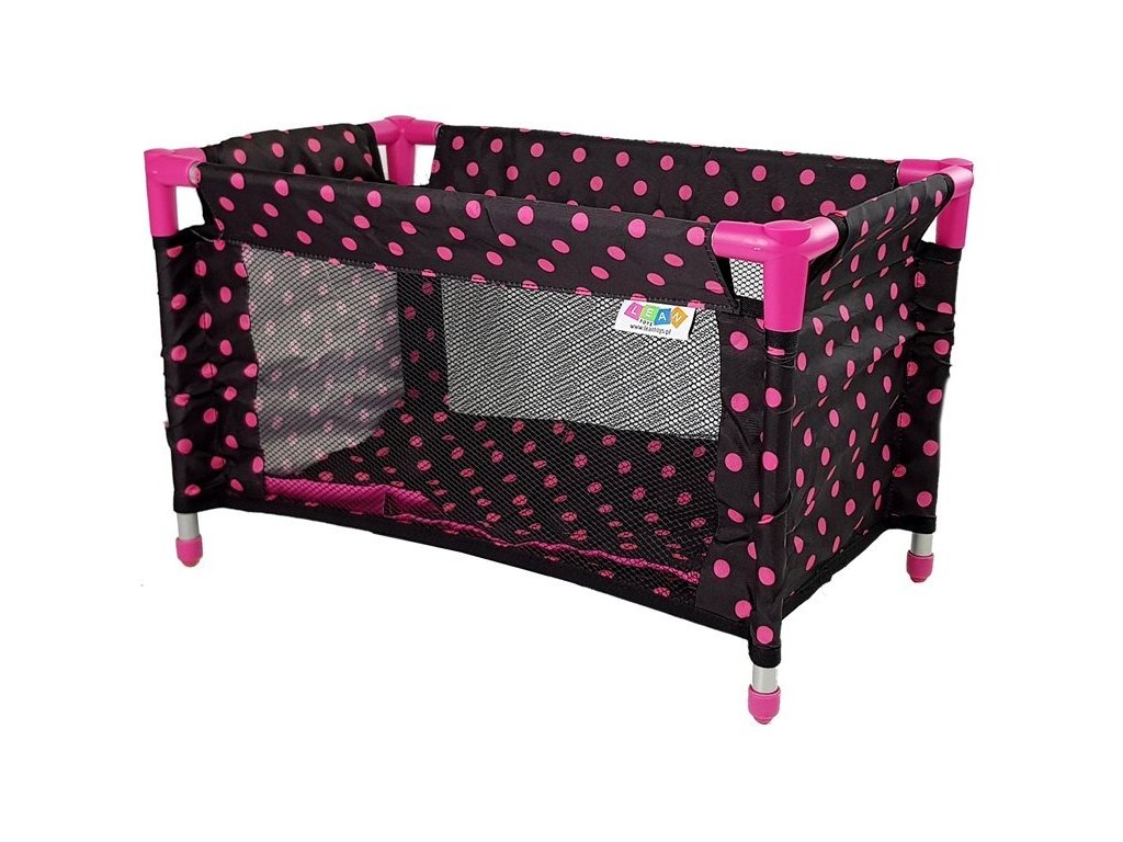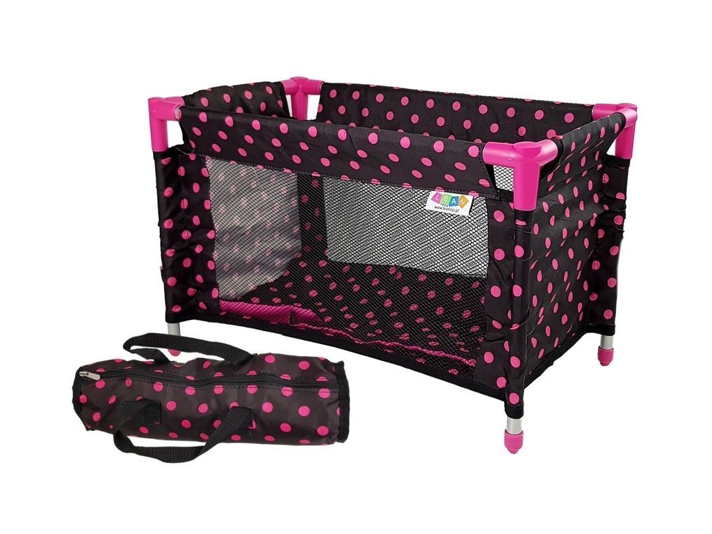 Postieľka pre bábiky je krásny herný doplnok, ktorý zaujme každú dievča. Bábika teraz bude mať svoj vlastný kútik a miesto, kde si môže oddýchnuť. Vďaka sieťovaným stranám postieľky môže dievča sledovať, čo sa deje s bábikou, a strážiť. Rám je vyrobený z hliníka s ružovými plastovými spojmi. Sada obsahuje prikrývku a vankúš. Celá postieľka a prvky sú čierne s ružovými bodkami. Postieľku možno ľahko zložiť a zbaliť do prenosnej tašky, takže si ju môžete vždy vziať so sebou. Do postieľky sa zmestí bábika o veľkosti asi 40 cm.