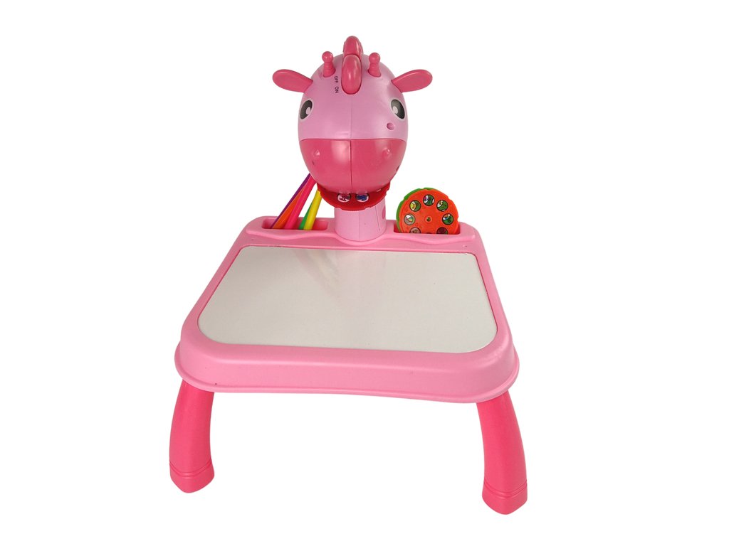 Na výber máme celkom 24 pekných farebných obrázkov ako sú zvieratá, vozidlá, zelenina atď. Mazanie na podstavci môže byť priamo ovládané fixkou, obrázky môžeme mazať pomocou handričky, ktorá je tiež v sete. Môžete tiež namieriť projektor na stenu a premietnuť diapozitívy na stenu. Projektor môže tiež slúžiť ako svetlo. Vďaka stolu sa dieťa bude baviť na dlhé hodiny, trénovať koncentráciu, predstavivosť, trpezlivosť a manuálne zručnosti!