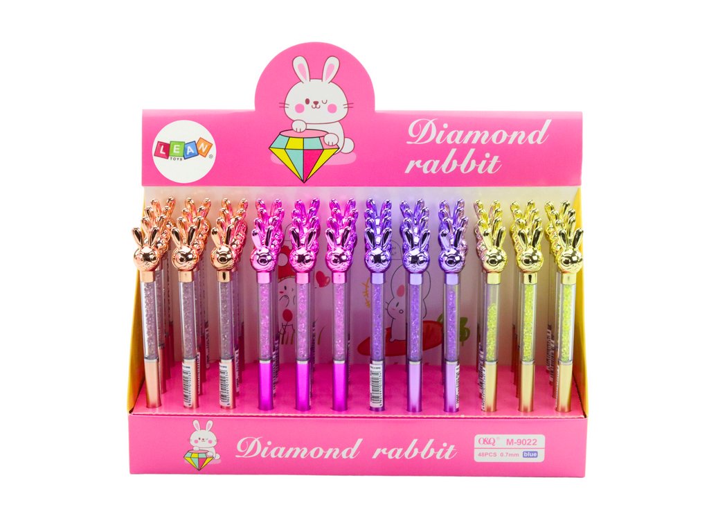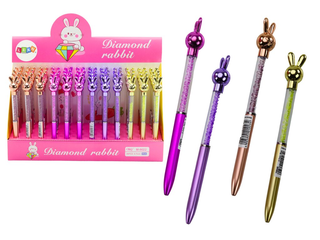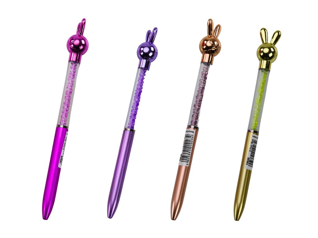 Táto elegantná pera so zajačikom kombinuje štýl a originalitu. Priehľadné telo s lesklými kamienkami dodáva luxusný vzhľad, zatiaľ čo figúrka vytvára jedinečný detail.