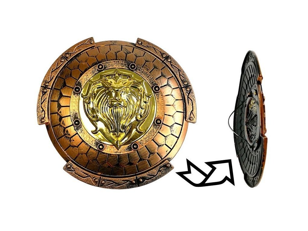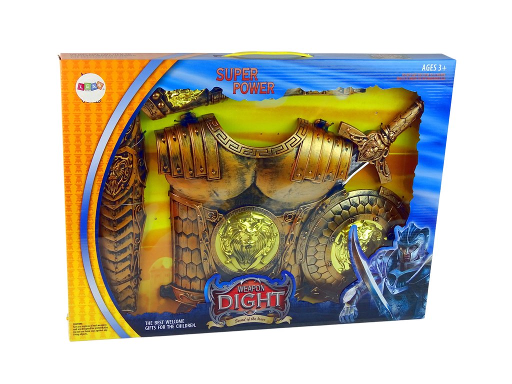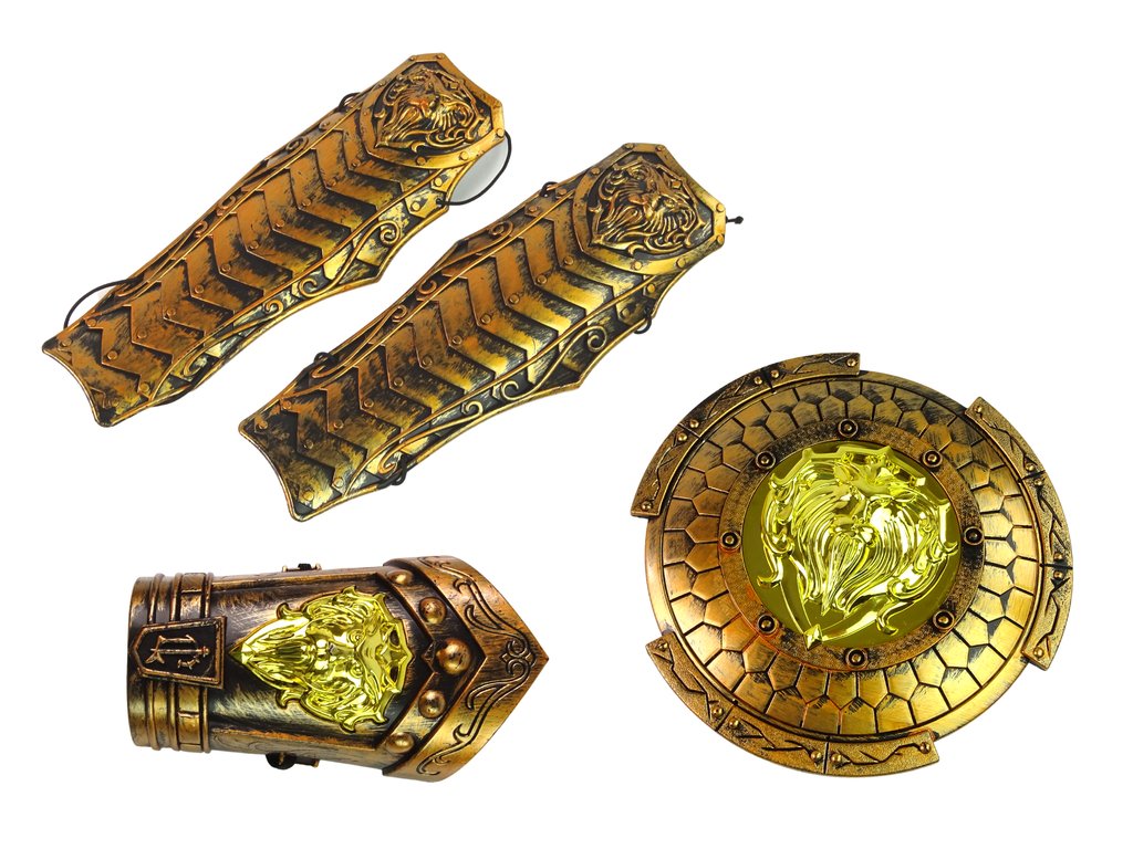 Krásne zlaté brnenie s doplnkami prenesie vaše batoľa do rozprávkového sveta. Chrániče nôh, štít a brnenie sú vyrobené z tvrdého plastu, počas bojov budú tvoriť silnú ochranu.
