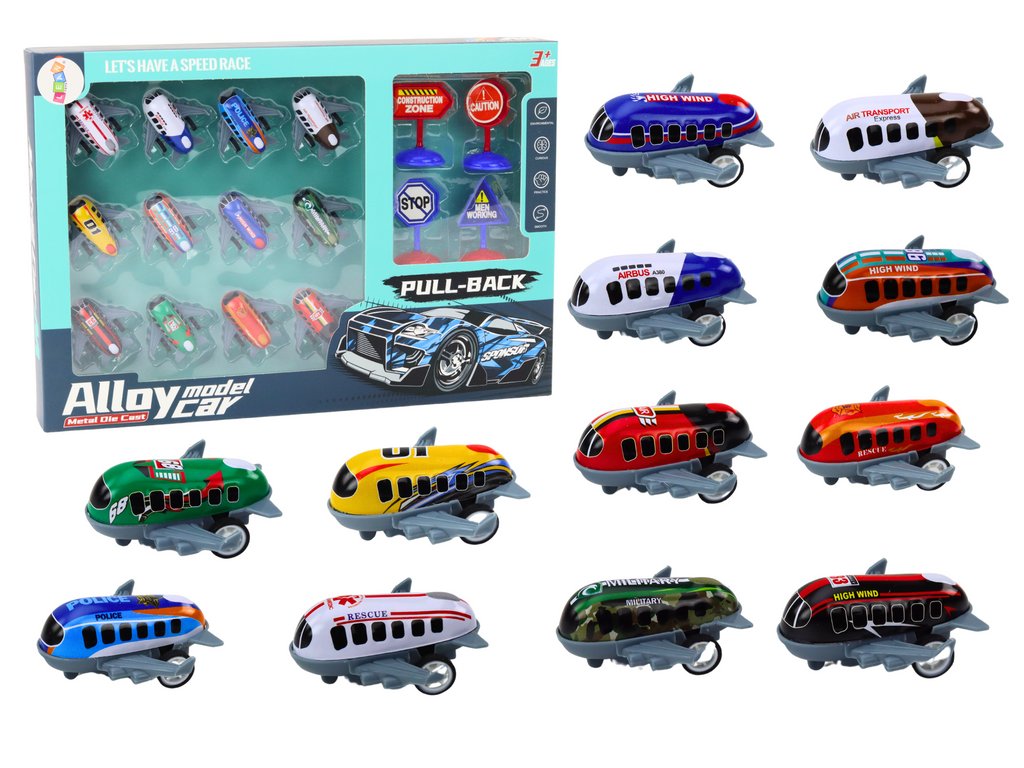Sada 12 autíčok v tvare lietadiel s pohonom, ktoré sú ideálne pre mladých nadšencov do letectva a techniky.