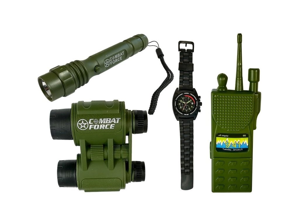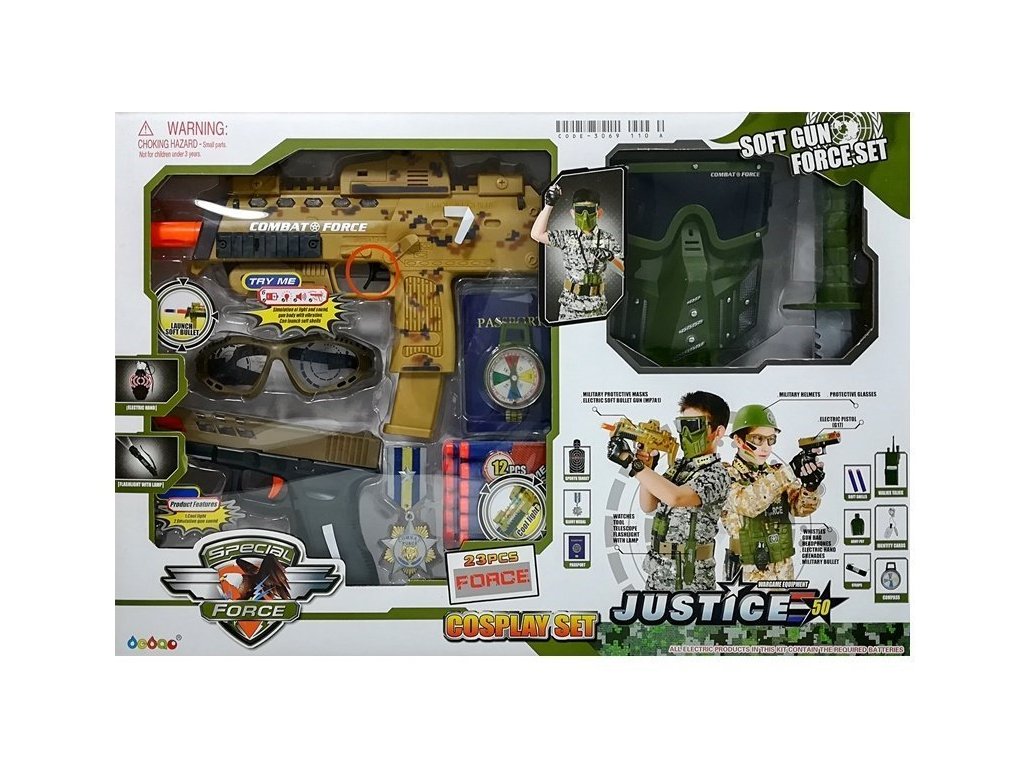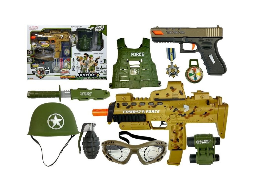 Táto vojenská súprava prináša akčnú zábavu vďaka realistickým doplnkom a dvom hračkám napodobňujúcim strelné zbrane, ktoré umožňujú hru pre dve deti naraz. Súčasťou sady sú ochranné doplnky ako helma, vesta a bojová maska, takže malí nadšenci môžu zažiť pravé vojenské dobrodružstvo. MP7 aj Glock 17 sú vybavené batériami, ktoré dodávajú realistické zvukové efekty , a strojová pištoľ navyše strieľa penové náboje .
