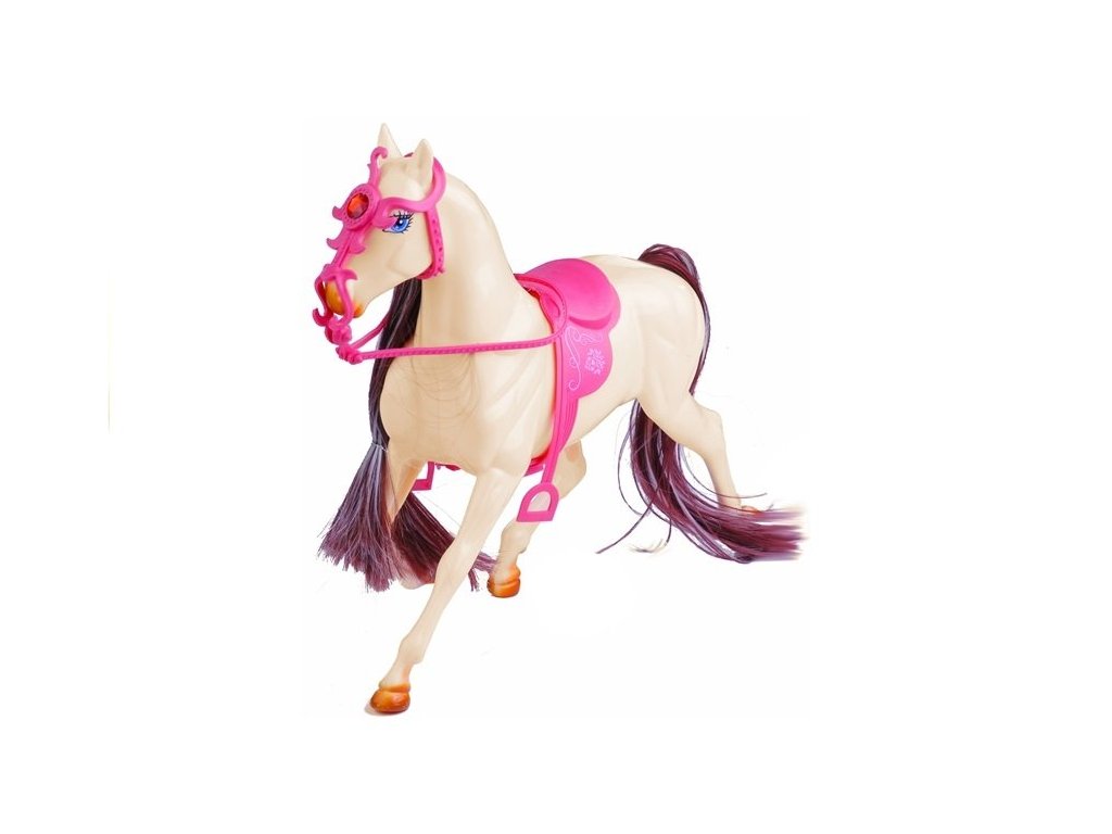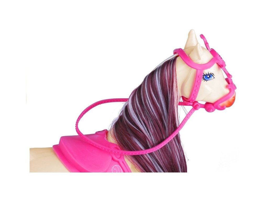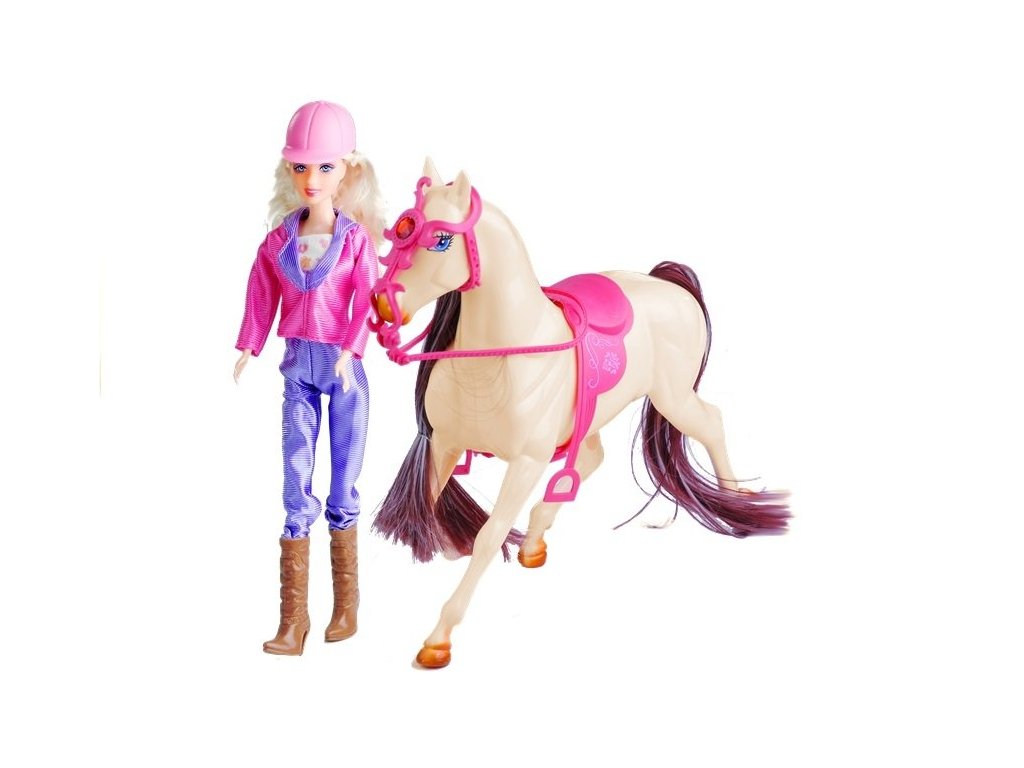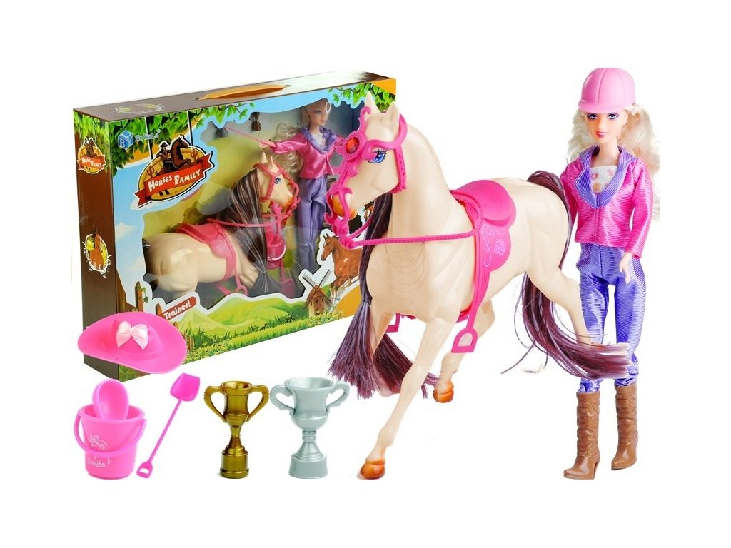 Set, ktorý sa skladá z veľkého bieleho koňa, bábiky a mnohých doplnkov, ktoré sú nevyhnutné pre prácu v stajni. Biely kôň impozantnej veľkosti má krásnu hrivu a dlhý hnedý chvost, ktorý nielenže svieti, ale je veľmi príjemný na dotyk. Kôň má mäkké sedlo, ktoré je zdobené elegantnými ornamenty. Tréningová bábika má štíhlu postavu a dlhé, ľahko kučeravé vlasy. Je oblečená v dvojdielnom obleku vyrobenom z lesklého materiálu, ktorý možno okoreniť vysokými podpätkami kovbojských topánok zahrnutých v sade.