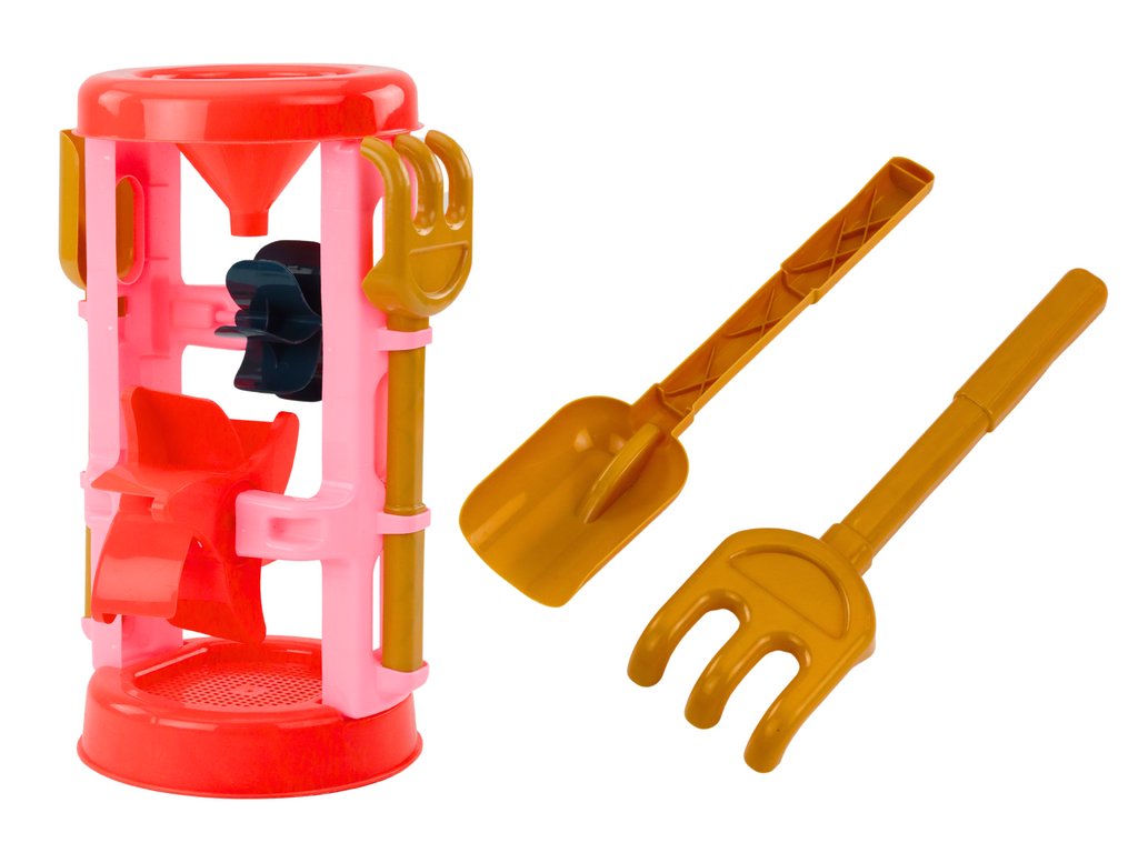 Zostav hračiek do piesku s mlynčekom je perfektná sada pre deti, ktoré milujú hranie na pláži alebo v pieskovisku. Hlavným prvkom sady je veľký mlynček, ktorý prináša veľa radosti a možností kreatívnej hry. Mlynček je navrhnutý pre všestranné použitie: z jednej strany má sitko, ktoré umožňuje preosievanie piesku, az druhej strany lievik, ktorým piesok voľne prúdi a poháňa kolesá mlynka.