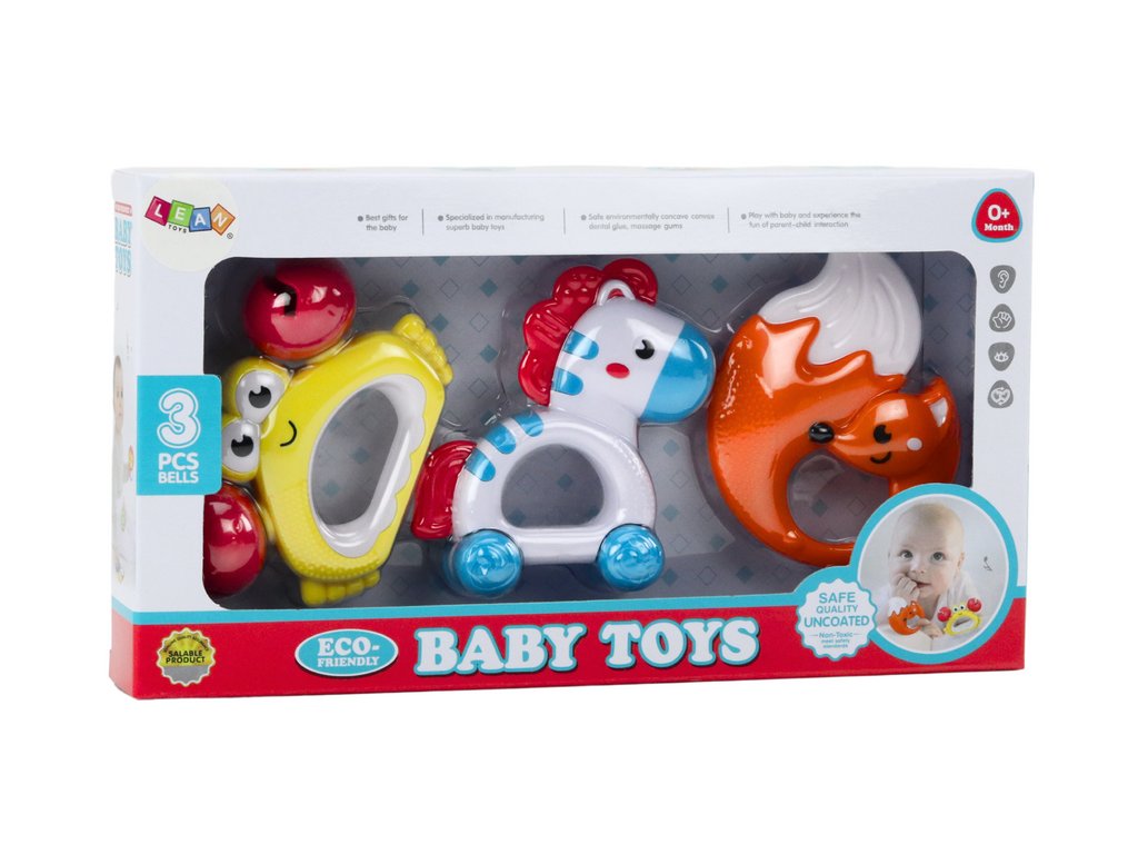 Set hrkálok pre dojčatá je ideálnou voľbou pre najmenších, skladajúci sa z troch roztomilých hrkálok v tvare líšky, zebry a kraba. Každá hrkálka je navrhnutá v jasných, pútavých farbách, ktoré stimulujú zrak a záujem dieťaťa.