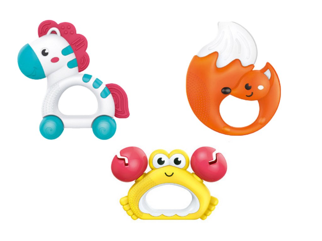 Hračky obsahujú hrkajúce prvky, ktoré pri trasení vydávajú zvuky, čo pomáha rozvíjať sluch, zvedavosť dieťaťa a jeho motorické zručnosti. Navyše sú hračky vybavené gumovými prvkami, ktoré fungujú ako hryzátka. Tieto bezpečné, mäkké prvky sú ideálne na hryzenie a prinášajú úľavu počas prerezávania zubov.