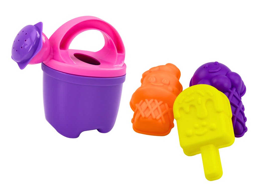 Súprava obsahuje tiež nevyhnutné doplnky pre hru na piesku: lopatku, hrable, kanvičku a tri formičky.