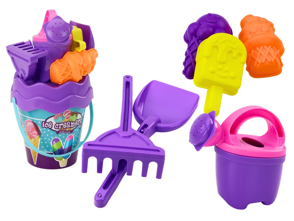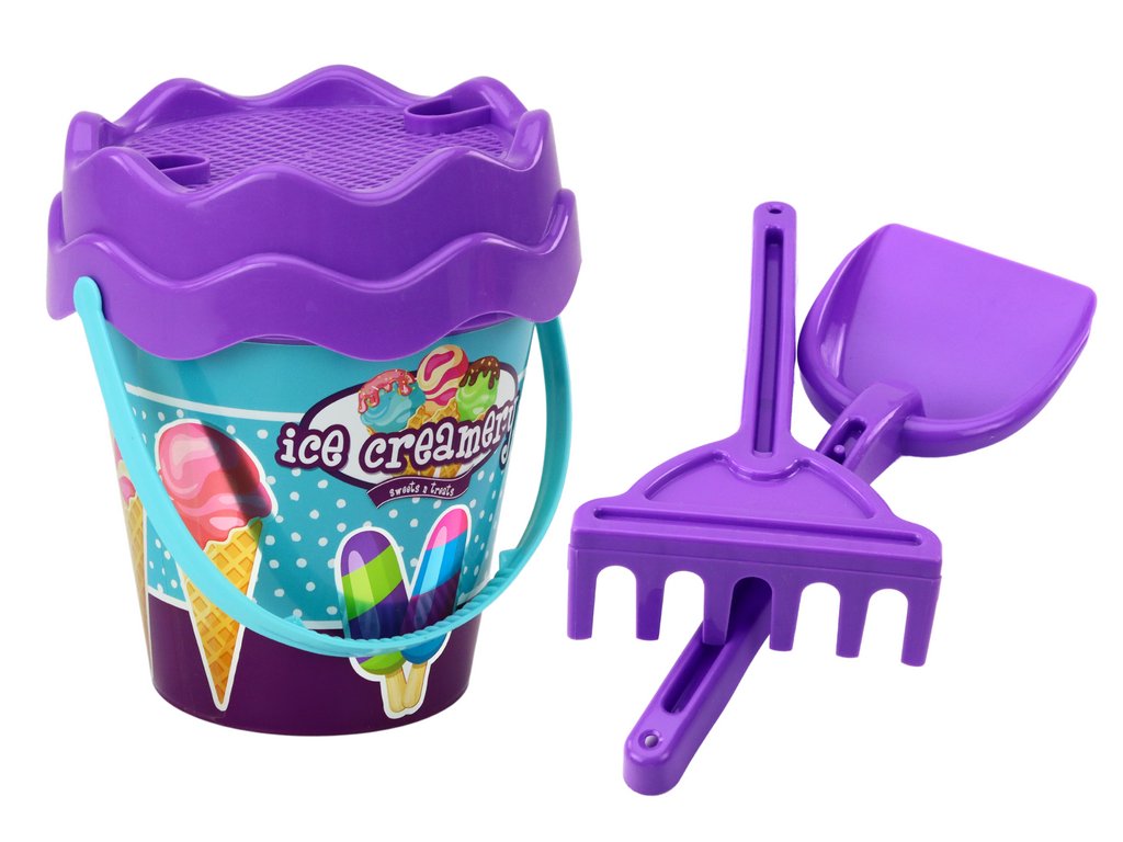 Súprava na piesok vo vedierku so zmrzlinami je skvelý tip pre deti, ktoré milujú kreatívnu zábavu na pláži av pieskovisku. Centrálnym prvkom sady je fialový kýblik, ktorý zdobí motív zmrzliny.