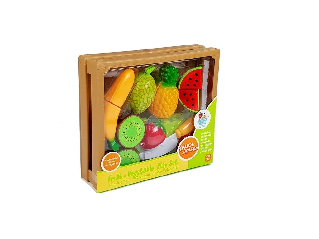 Ovocie možno krájať na polovicu, sú k sebe pripevnené suchým zipsom, takže je ľahké ich neskôr spojiť. Sada ďalej obsahuje nôž, malú krájací dosku a debničku.