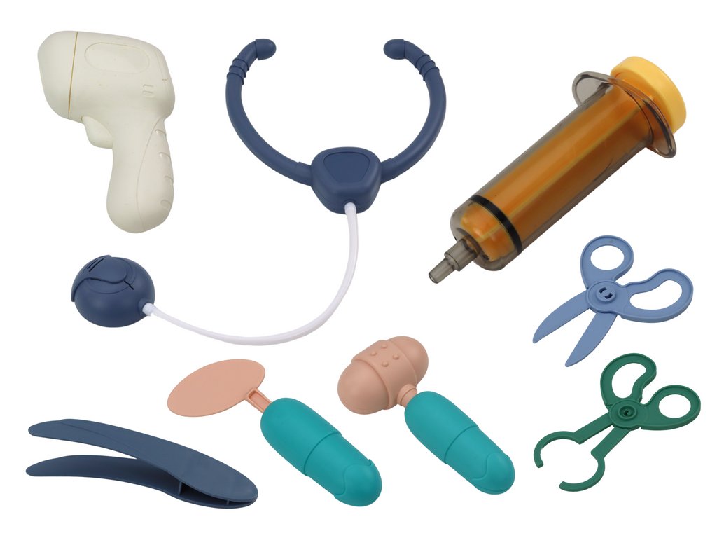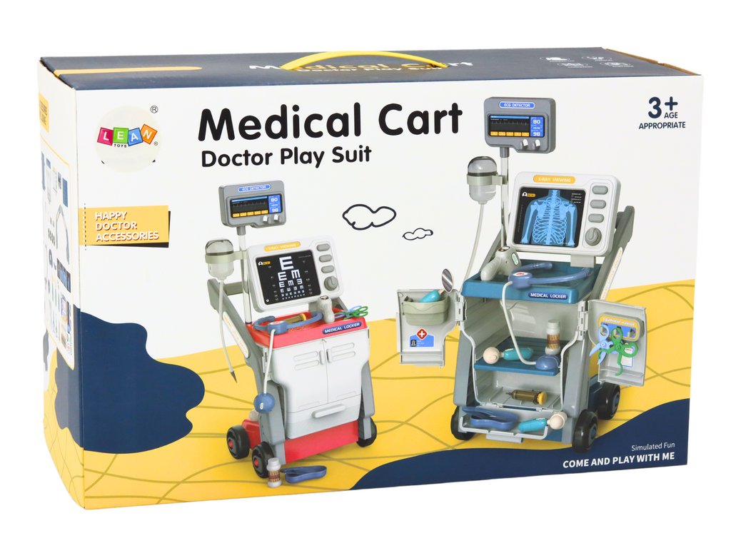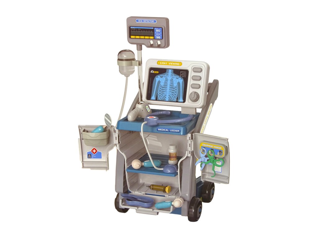 Predstavujeme vám modrú sadu pre malých lekárov , ktorá očaruje všetkých nadšencov medicíny. Súčasťou sady je "vozík" na kolieskach a tiež bohatý výber potrebných lekárskych nástrojov, vrátane injekcie, nožníc a stetoskopu na batérie.