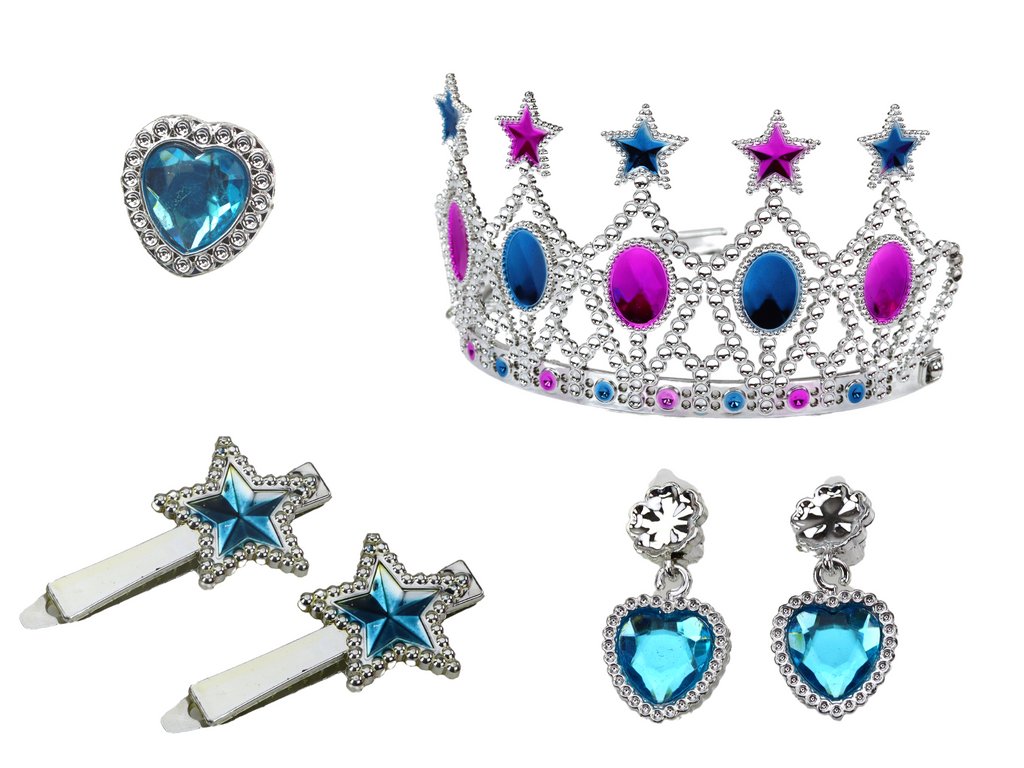 V komplete sa nachádza koruna ozdobená imitáciou diamantov v dvoch pôvabných farbách: modrej a ružovej. Táto koruna nielen pridáva lesk, ale taktiež sa stáva symbolom výnimočnosti, ktorú si každá malá princezná praje pocítiť.