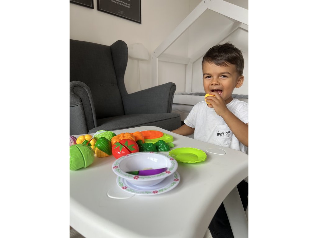Sada zeleniny do detskej kuchynky je nevyhnutné vybavenie pre malých kuchárov. Sada zeleniny je vyrobená v realistických tvaroch a farbách. Balenie obsahuje 10 kusov zeleniny so suchým zipsom a nôž, vďaka ktorému môžete zeleninu krájať. Súčasťou balenia je oranžová doska na krájanie.