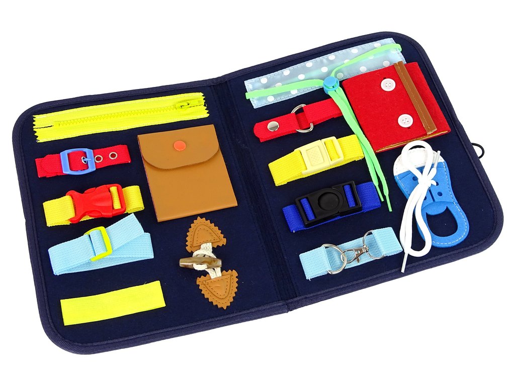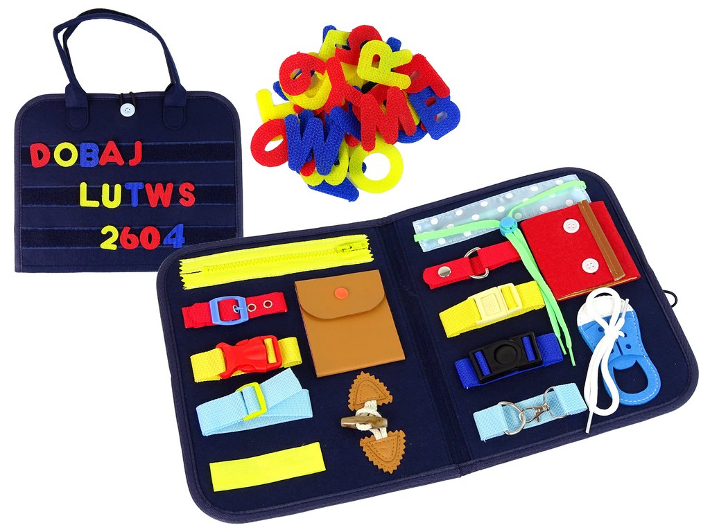 Kufor je vyrobený z filcu, čo je mäkký a príjemný materiál na dotyk a je ľahko prenosný. Dieťa ho môže vziať so sebou na výlet. Každý prvok má iný tvar a textúru, čo pomáha stimulovať zmysel hmatu. Zručnosti ako zapínanie a prepínanie v rôznych kombináciách sa pre neho stanú samozrejmosťou.