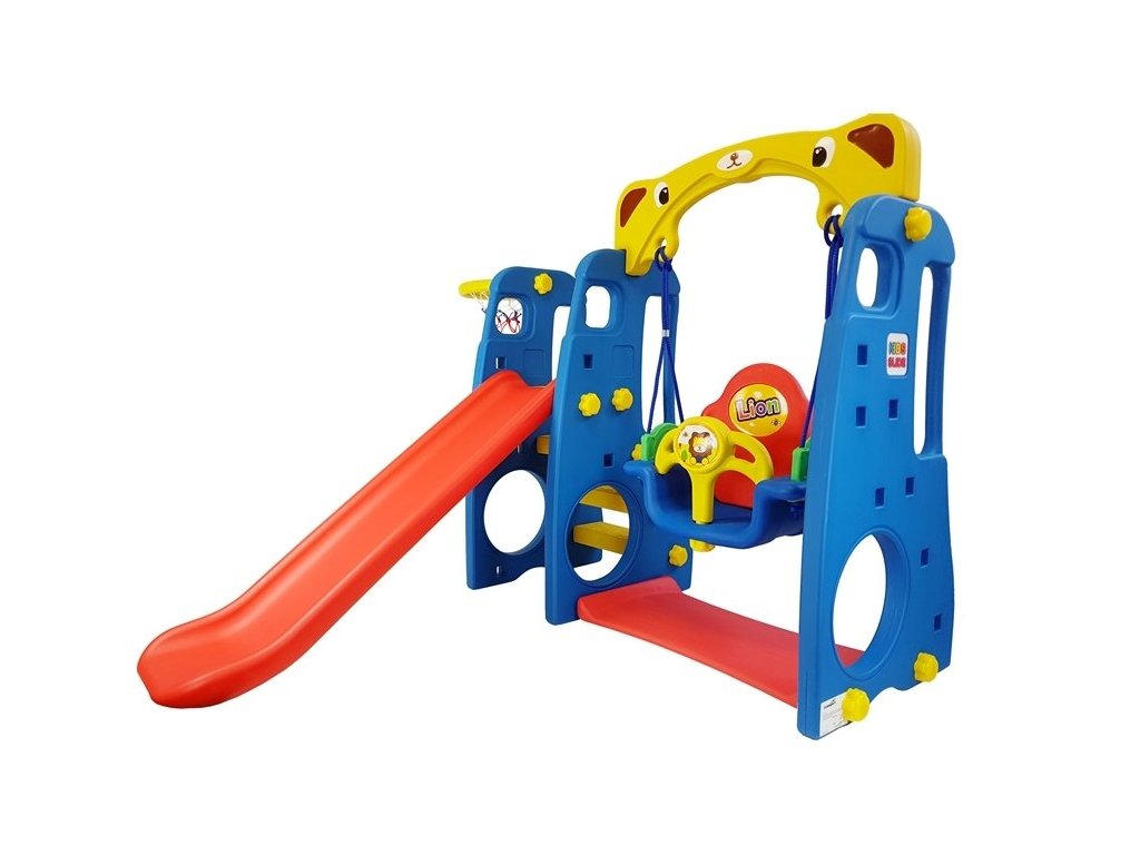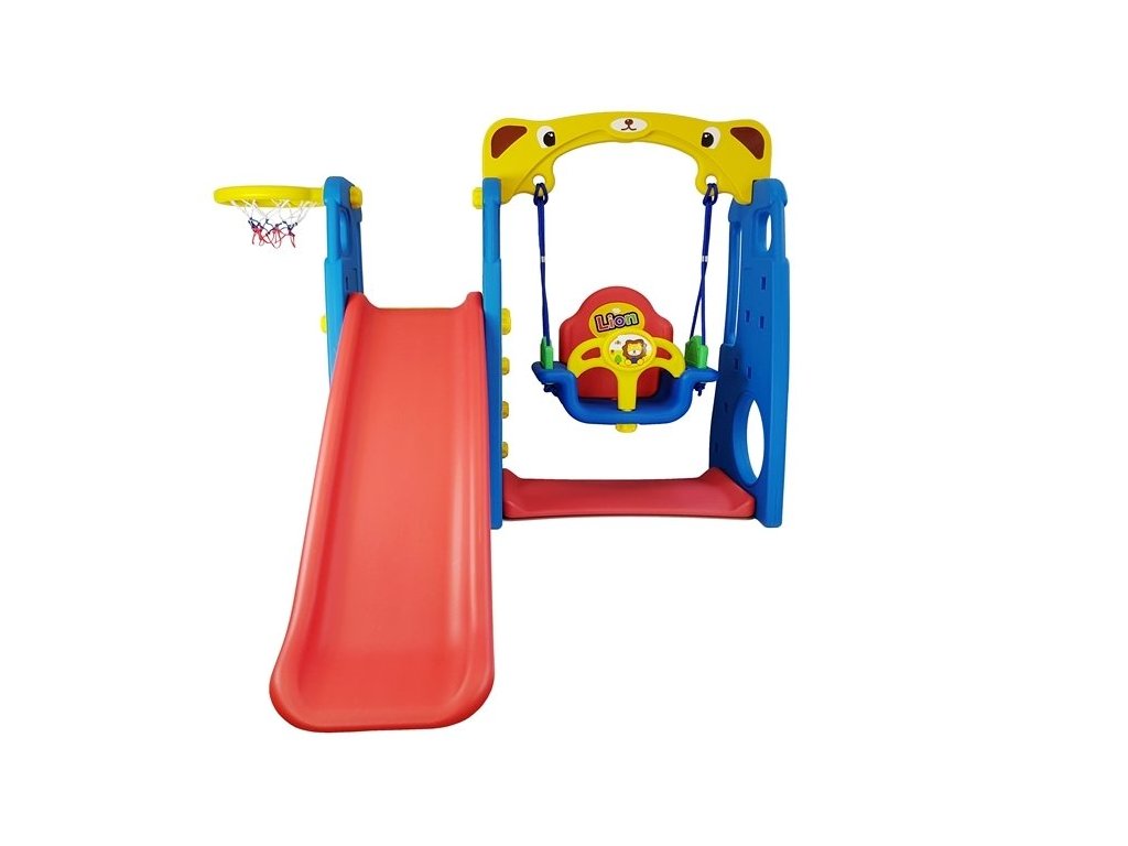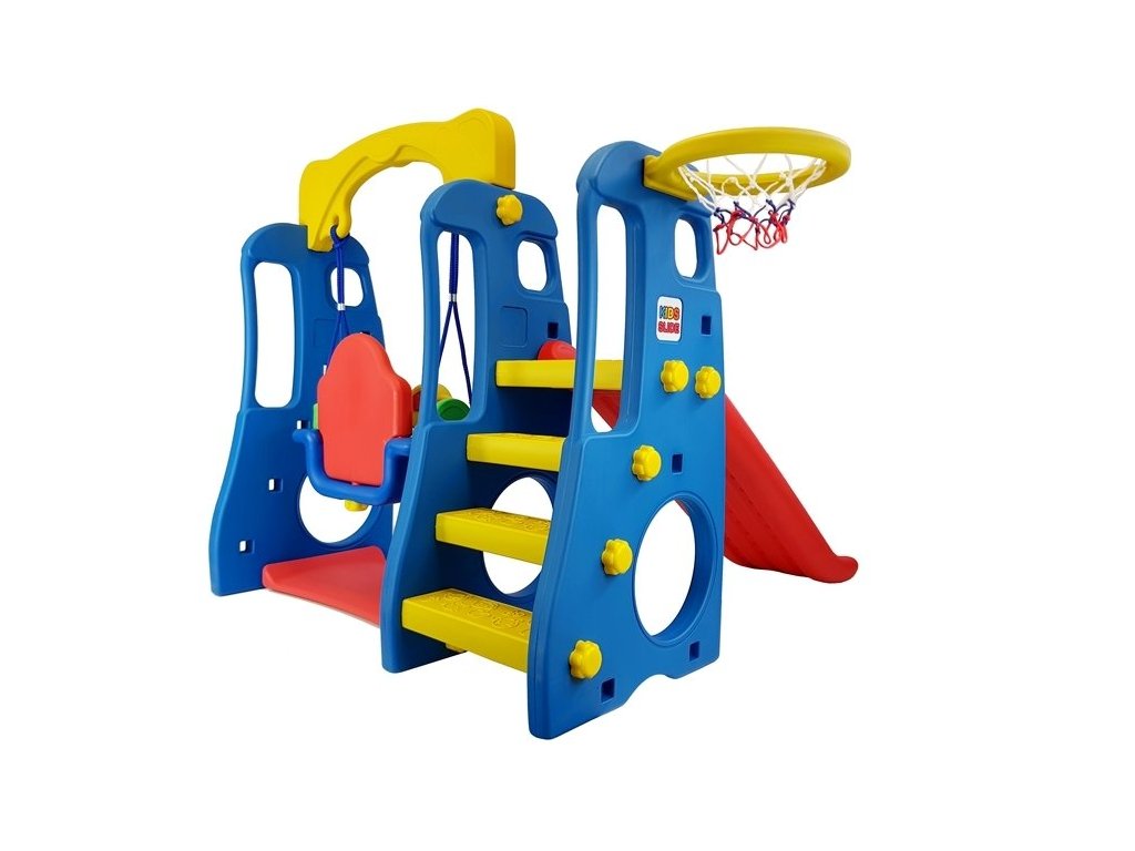Záhradná hojdačka so šmykľavkou a basketbalovým košom . Zostava je možné zložiť dvoma spôsobmi, s košom po pravej alebo po ľavej strane. Šmykľavku možno polohovať v závislosti od veku dieťaťa. Zostava je vhodná do interiéru aj na záhradu. Všetky steny a komponenty sú vyrobené z dvojitej vrstvy plastu. Vhodná veková kategória od 1,5 roka . Výrobok má európsky certifikát bezpečnosti CE.