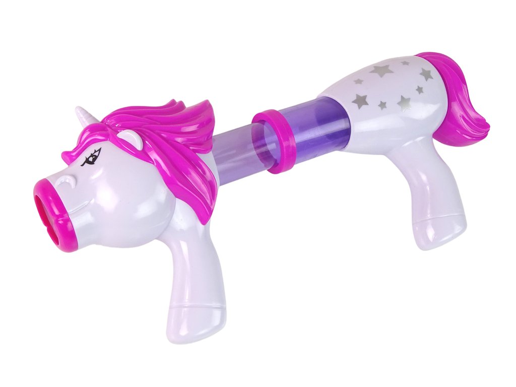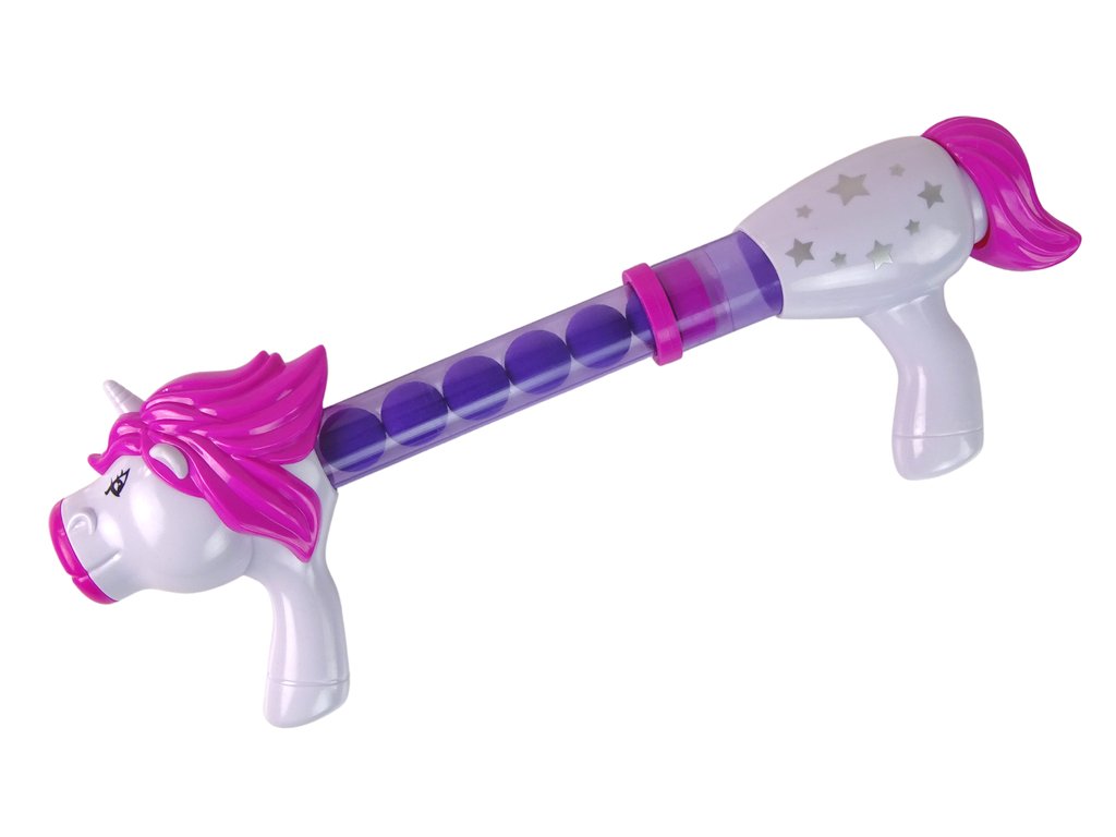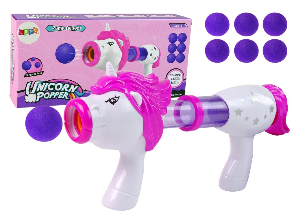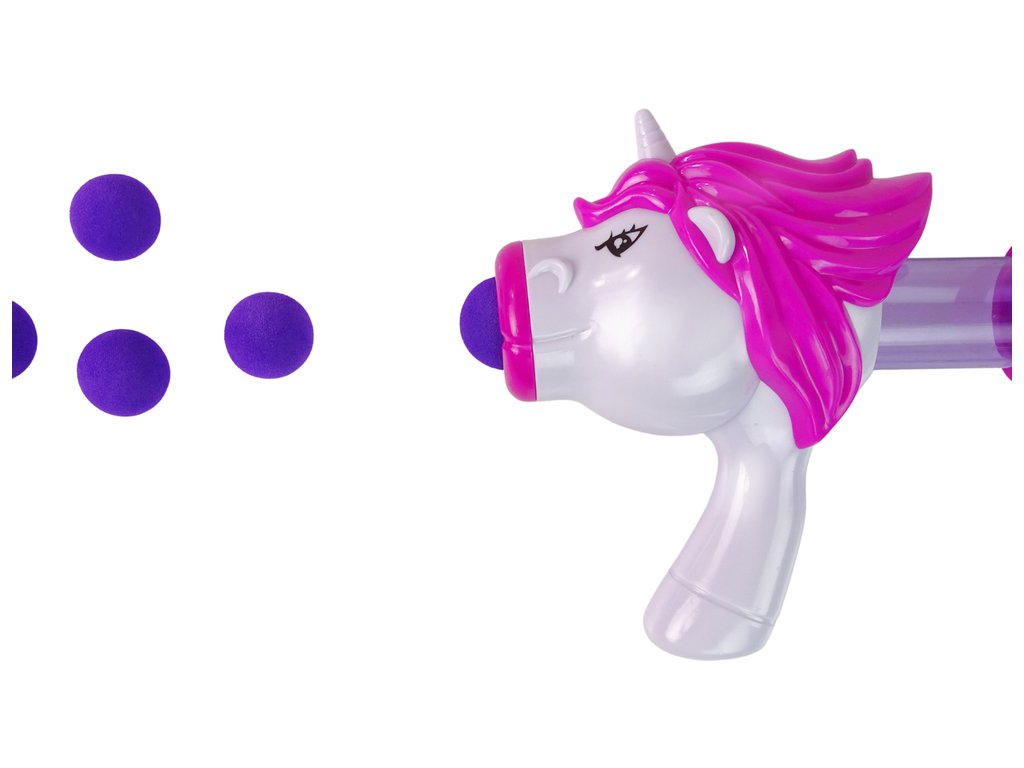 Pištoľ v podobe jednorožca s priesvitným zásobníkom, vo ktorom môžete ľahko sledovať počet ešte dostupných nábojov. Stačí vložiť loptičky do zásobníka, oddialiť a zavrieť spúšť a odpor vzduchu tlačí loptičky dopredu.