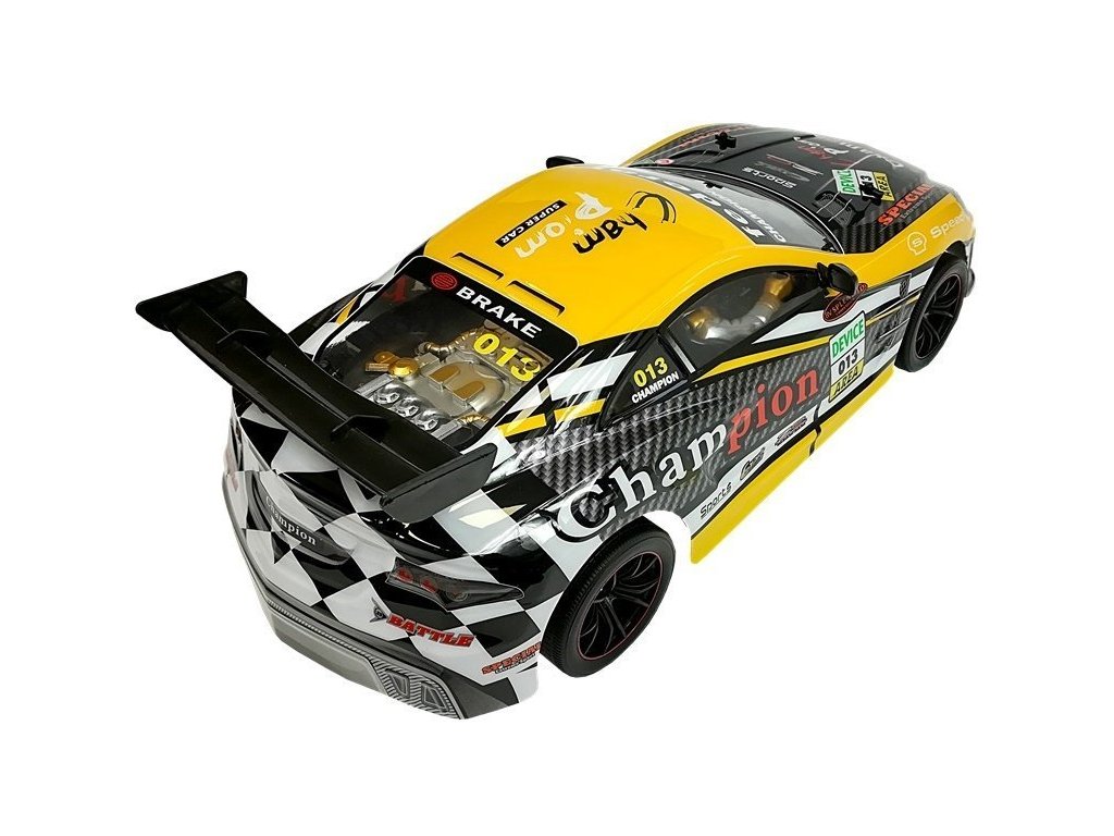 Dodávaný diaľkový ovládač funguje na frekvencii 2,4 G , čo eliminuje rušenie počas hry. S tlačidlami pre ovládanie dopredu-späť a vpravo-vľavo, je riadenie jednoduché a intuitívne. Žltá farba s atraktívnymi nálepkami, otvorený vzhľad motora a aerodynamický dizajn dodávajú autu závodný vzhľad.