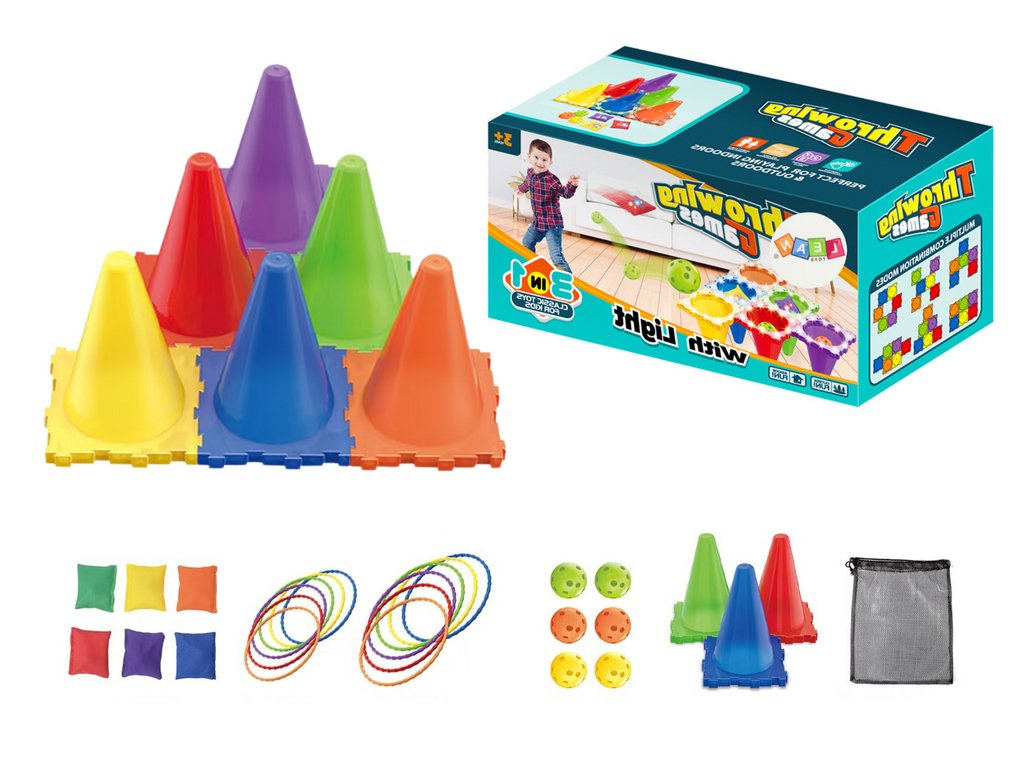 Športový herný set 3v1 je všestranná sada, ktorá poskytuje množstvo aktívnej a kreatívnej zábavy doma aj na záhrade. Skladá sa z kužeľov , ktoré slúžia ako terče, a troch rôznych predmetov na hádzanie: obručou, vriec a lôpt . Vďaka tejto rozmanitosti umožňuje sada mnoho foriem hry, od klasických hier, až po vymýšľanie vlastných výziev a úloh.
