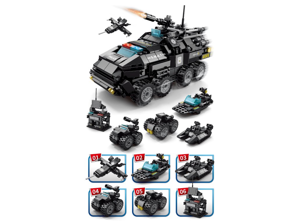 Každý model má realistické detaily, ktoré podporujú detskú predstavivosť a umožňujú vytvárať rôzne scenáre zásahov elitnej jednotky SWAT. Diely sú kompatibilné s väčšinou bežných stavebníc, takže je možné ich kombinovať a rozširovať.