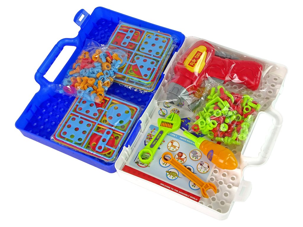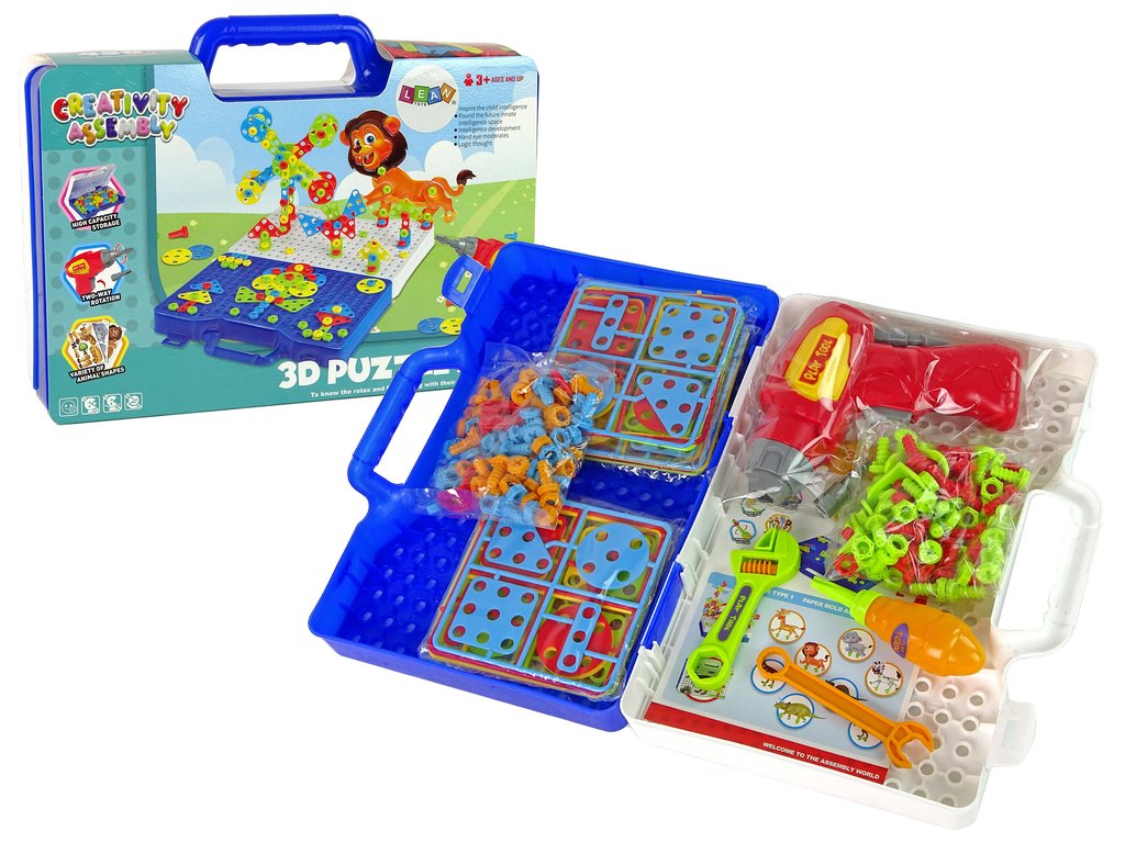 V sade nájdete skrutky v rôznych farbách (zelené, červené, modré, oranžové) a farebné kľúče, skrutkovač a kovanie. Puzzle sú v 4 tvaroch a 4 farbách, čo poskytuje obrovské možnosti na tvorbu stavieb a ďalších majstrovských diel ako v 3D verzii, tak v klasickom nákrese. Všetky prvky sady sú vyrobené z vysoko kvalitného plastu.