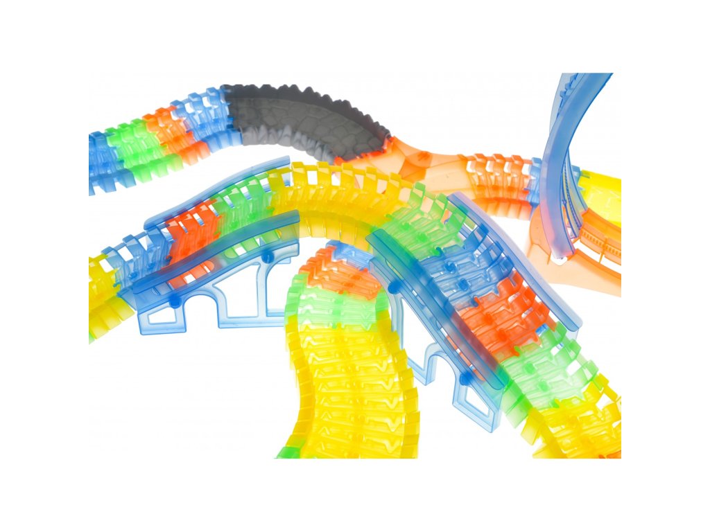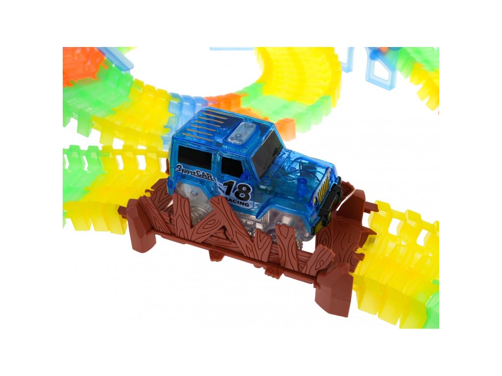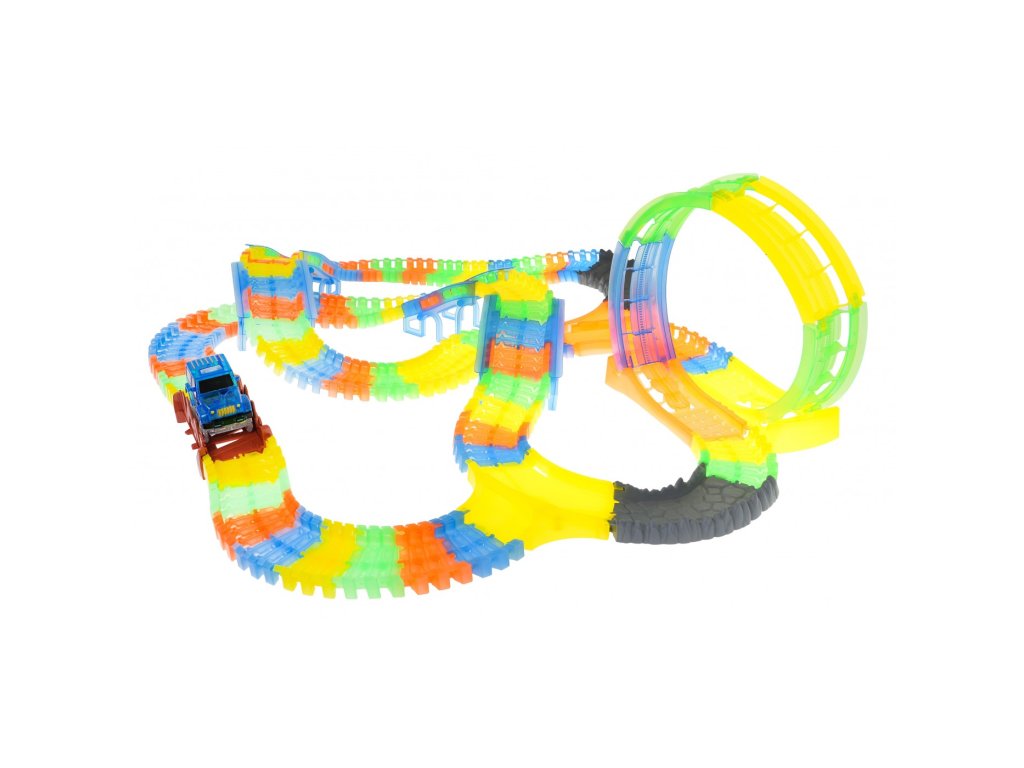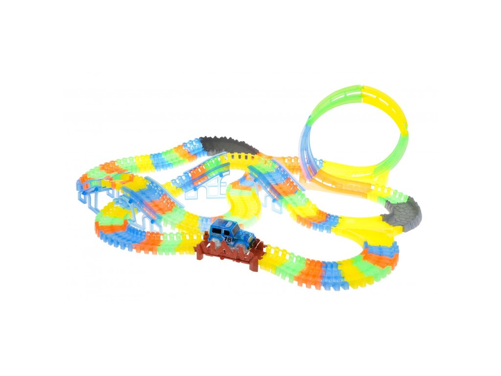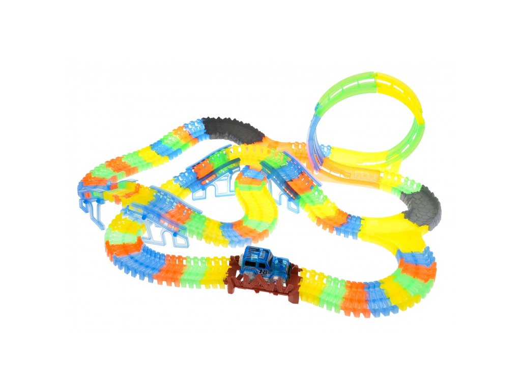 Svietiaca autodráha značky s autíčkom zaistí každému dieťaťu veľa zábavy. Autíčko má LED podsvietenie, jazda v tme vytvára úžasný efekt. Vozidlo je napájané 2 batériami AA 1,5 V, ktoré nie sú súčasťou balenia. Ak chcete auto naštartovať, stačí stlačiť tlačidlo na jeho streche. Celková dĺžka dráhy je 446 cm.