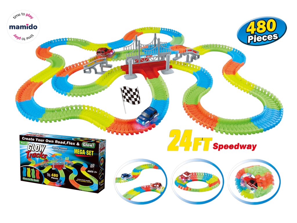 Sada obsahuje 480 dielikov, z ktorých si postavíš až 7,3 metra dlhú dráhu s mostom a križovatkami. Súčasťou sú aj 2 pretekárske autíčka so svetelnými efektmi, ktoré prechádzajú dráhou a vytvárajú jedinečnú svetelnú šou.