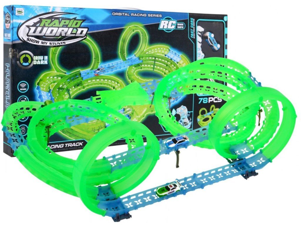 Svietiaca autodráha Magic Tracks obsahuje LED autíčka na diaľkové ovládanie, dve nabíjačky a prvky na zloženie autodráhy, ktoré svietia v tme!