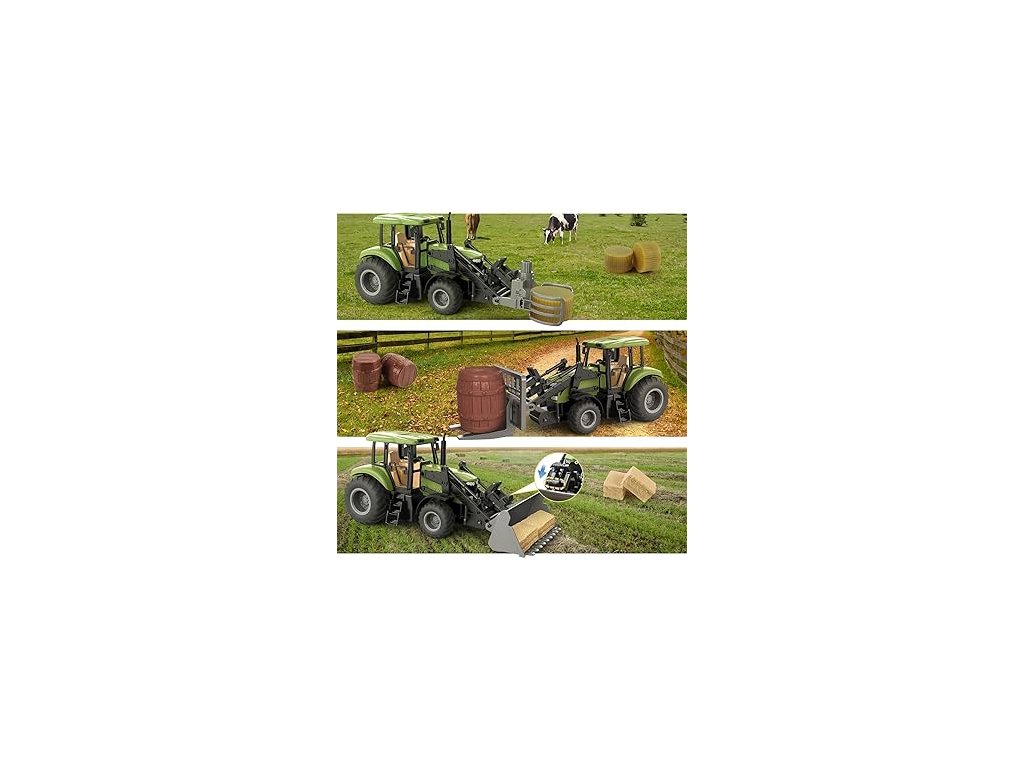 Skvelý RC farmársky traktor v mierke 1:16 prináša deťom realistický zážitok zo sveta poľnohospodárskych strojov. Traktor je vybaven 7-kanálovým ovládačom a umožňuje nielen jazdu vpred, vzad, doľava a doprava, ale aj prácu s čelným nakladačom. Súčasťou balenia sú tri vymeniteľné nástavce – lopata, kliešte a vidlica, vďaka ktorým si deti môžu vyskúšať rôzne činnosti na farme. Traktor má Bluetooth ovládanie, takže ho možno riadiť aj pomocou aplikácie v telefóne. O zábavu sa postarajú aj svetelné efekty. Umožňuje napodobňovať reálne činnosti traktoristu a podporuje kreativitu, fantáziu i motorické zručnosti.
