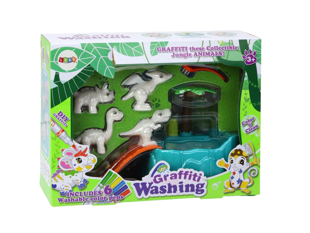 Sada pripomína skutočný salón pre dinosaurami, skladajúci sa zo štyroch realistických figúrok, šiestich farebných fixiek a vane s kefkou. Je to viac než len sada pre maľovanie – je to pozvánka na tvorivé myslenie, experimentovanie a rozvíjanie fantázie.