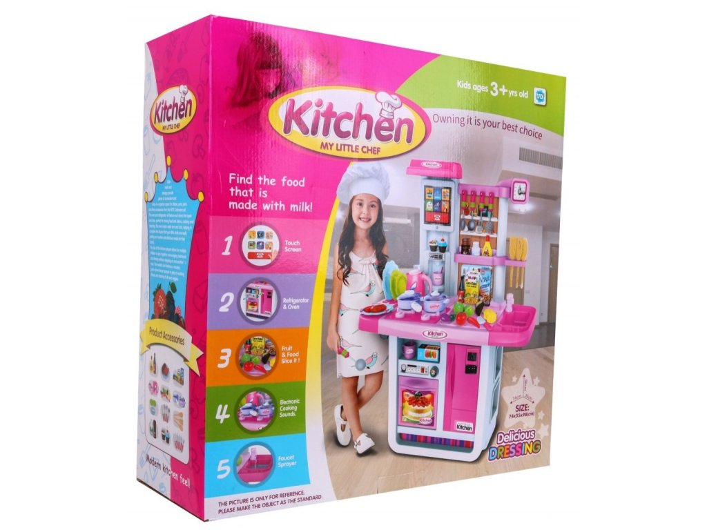 Predstavujeme Vám multifunkčnú detskú kuchynku , ktorá je plne vybavená. Kuchynka má kohútik s tečúcou vodou , 2 horáky , chladničku a rúru s otvárateľnými dvierkami. Kuchynka v čase varenia má svetelné a zvukové efekty. Ďalej sa v sade nachádza kompletný riad a potraviny , ktoré sa Vám pri varení budú určite hodiť. Ďalšou výhodou je dotykový panel zabudovaný do kuchyne. Dotykový panel sa po 1 minúte nečinnosti sám vypne, čo šetrí životnosť batérie. Kuchynka bola veľmi starostlivo vyrobená z kvalitného plastu. Vhodná veková kategória od 3+ rokov. Výrobok má európsky certifikát bezpečnosti CE.