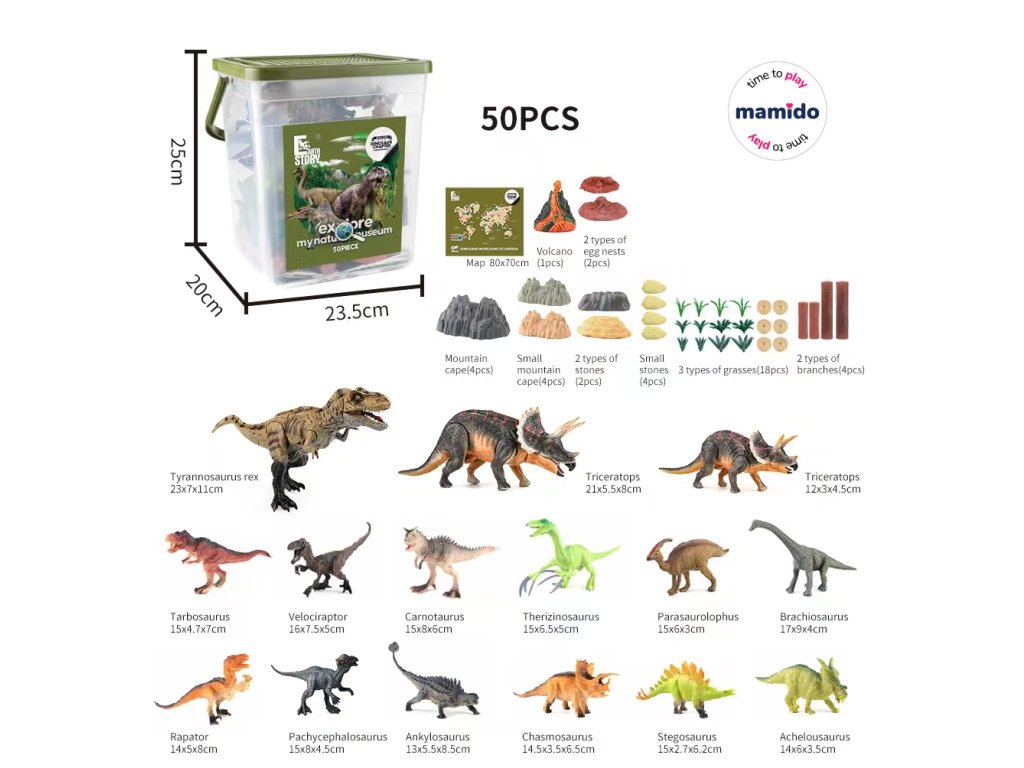 Vstúpte do pravekého sveta s touto veľkou súpravou dinosaurov, ktorá obsahuje 50 dielov vrátane realistických figúrok dinosaurov, sopiek, kameňov, konárov a podložky s mapou. Skvelá hračka pre malých objaviteľov, ktorí milujú dobrodružstvo a fascinujúci život dinosaurov.