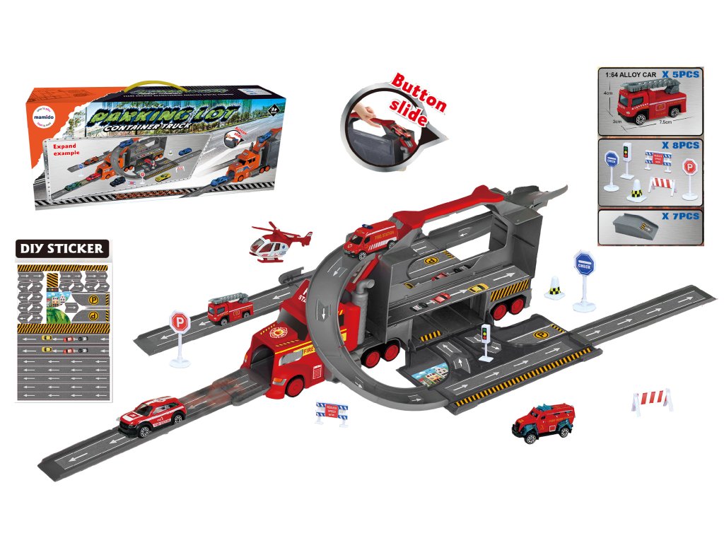 Veľký hasičský kamión s parkoviskom a dráhou je skvelou hračkou pre všetkých malých fanúšikov hasičov a záchranárskych akcií. Po otvorení sa kamión premení na parkovacie garáže s cestou, zákrutami a šmykľavkou. Súčasťou sú aj kovové hasičské autá v mierke 1:64, helikoptéra, dopravné značky a príslušenstvo, s ktorými si deti môžu vytvoriť vlastné hasičské mesto.